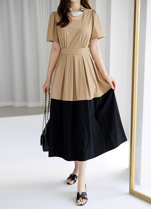 허리선이 살짝 위로 잡혀있고 아래로 플리츠되어 퍼지는 스커트 디자인으로 나와