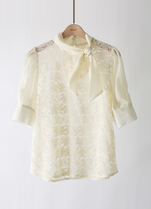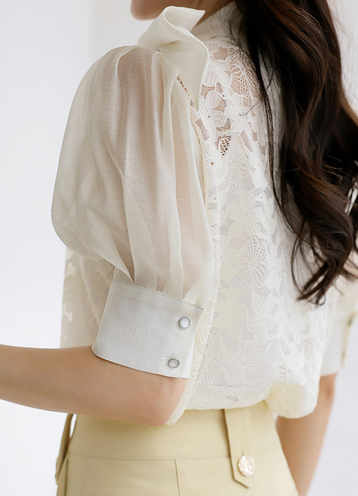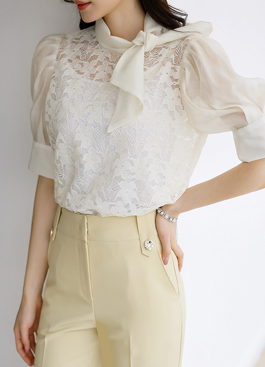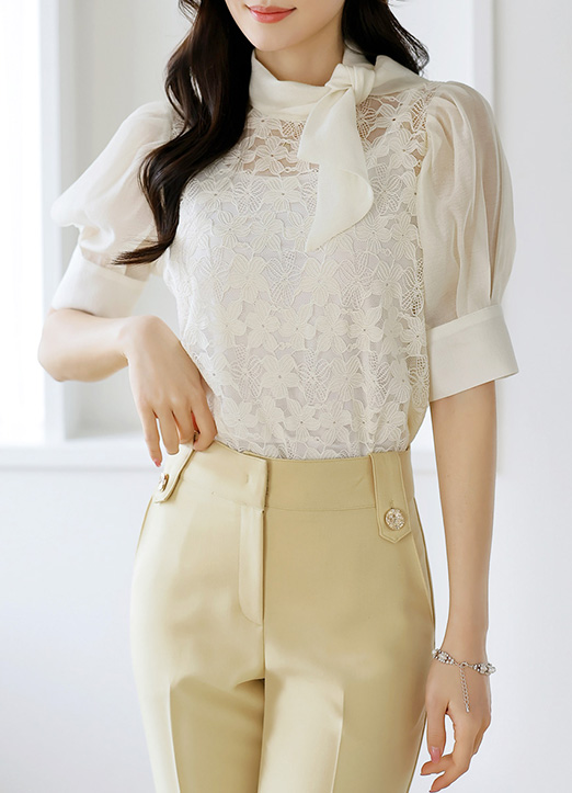 • [LouisAngel] 모엘드 쟈가드 플라워 레이스 쉬폰 배색 리본 타이 블라우스