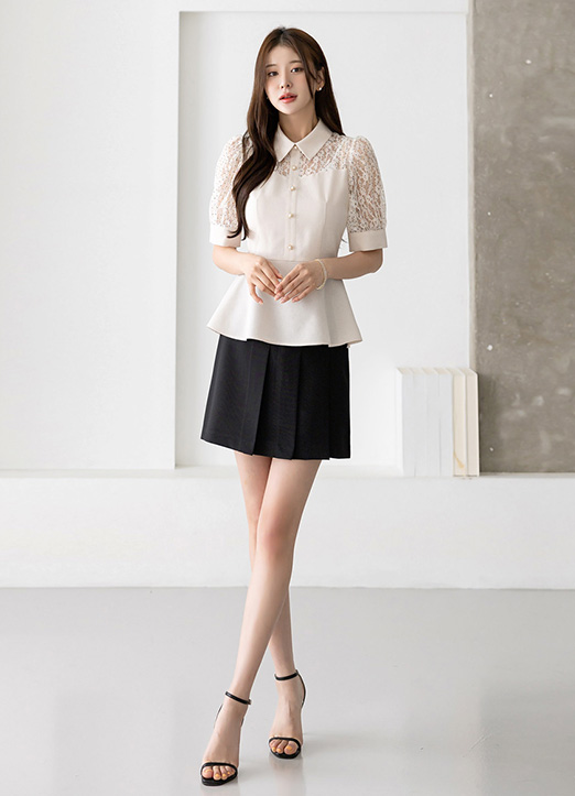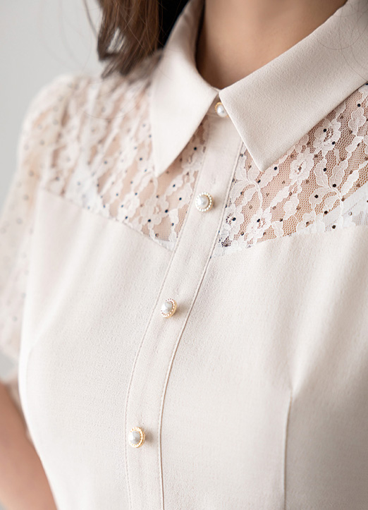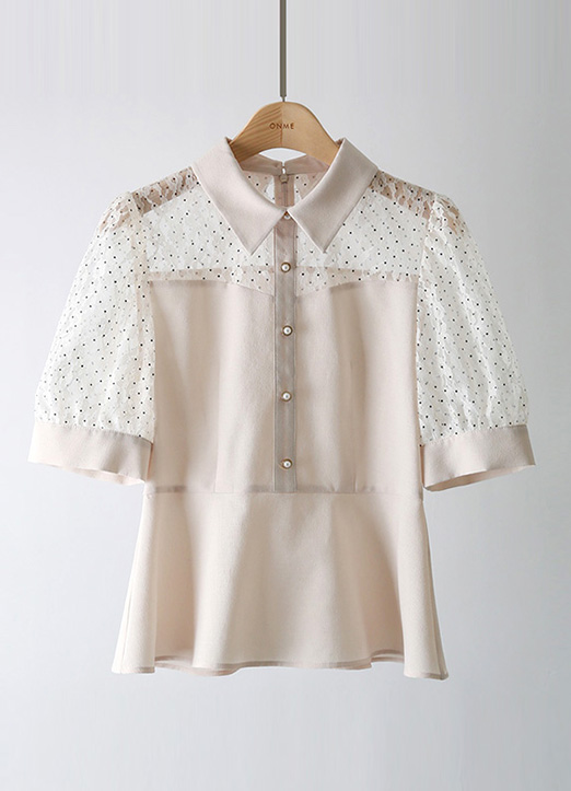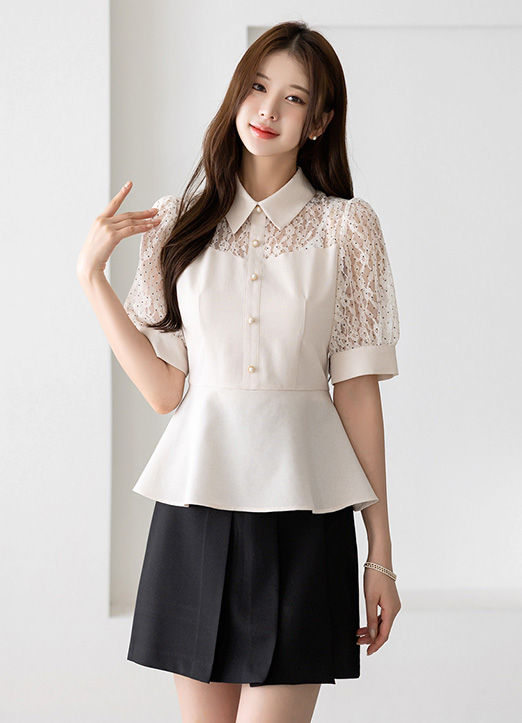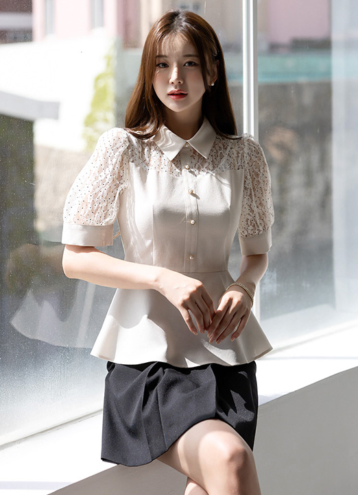 어깨와 소매 부분의 시스루한 도트 레이스 원단으로 배색을 더해주어