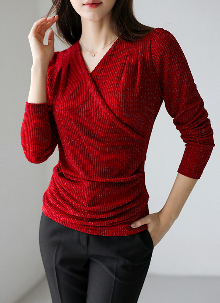 [LouisAngel] 샤인 펄 실키 텐션 볼륨 실루엣 셔링 랩 블라우스 티
