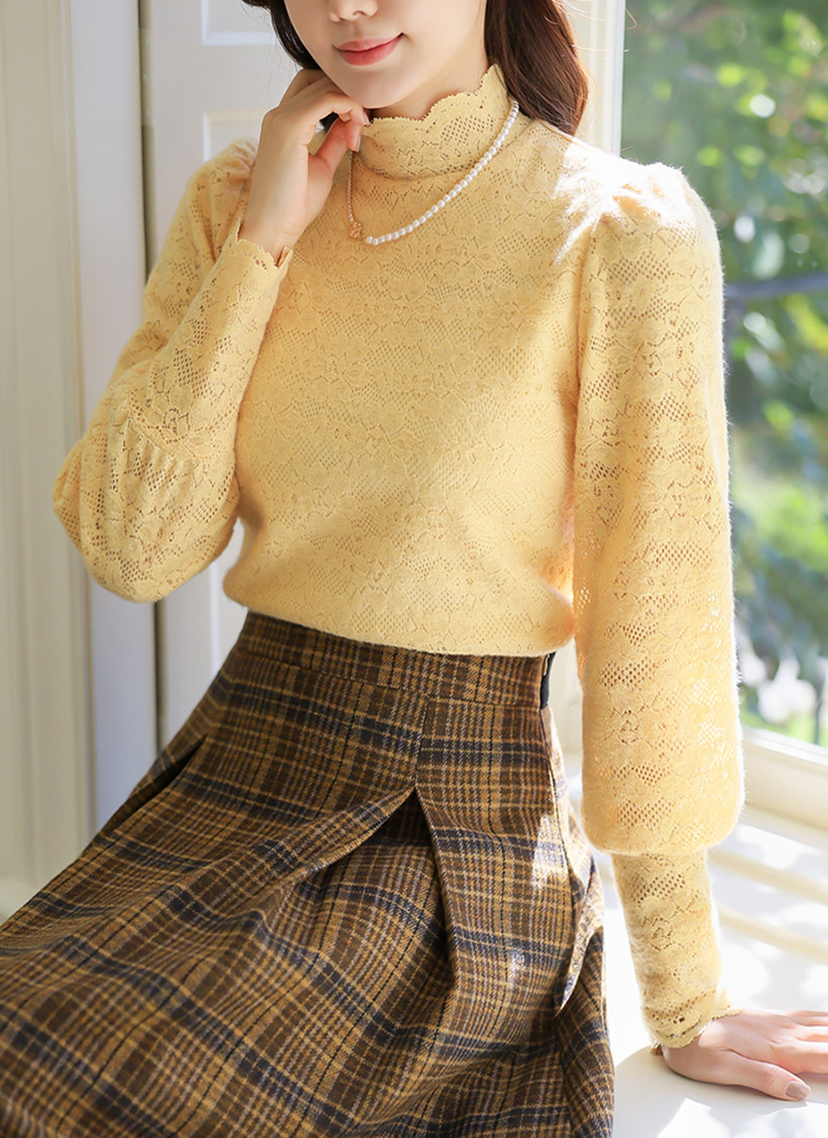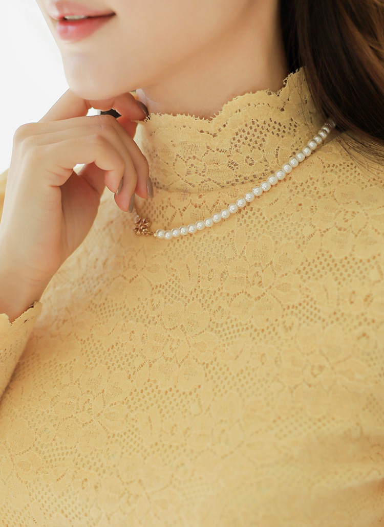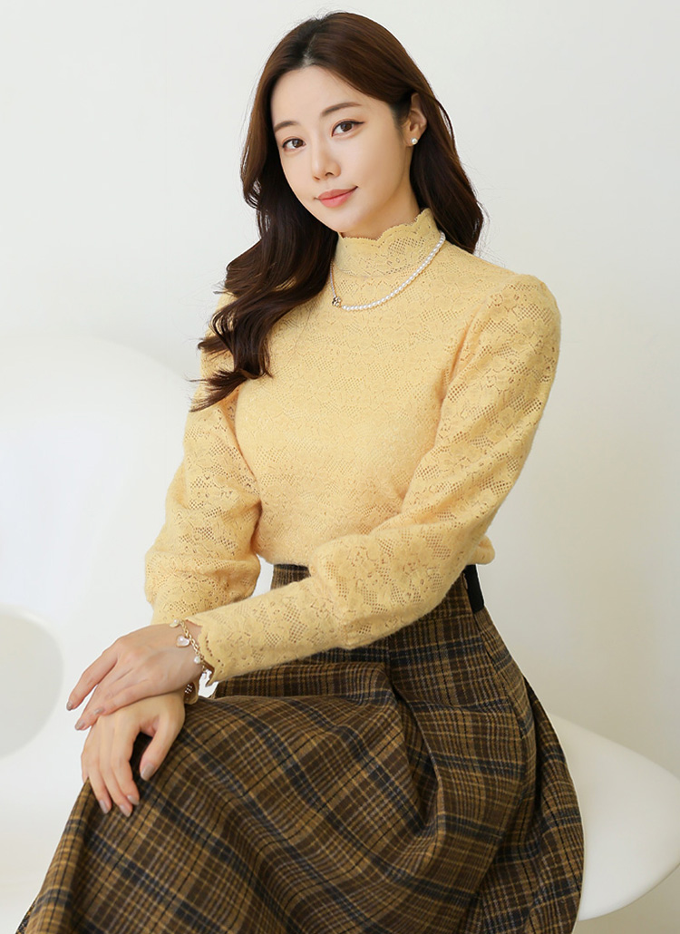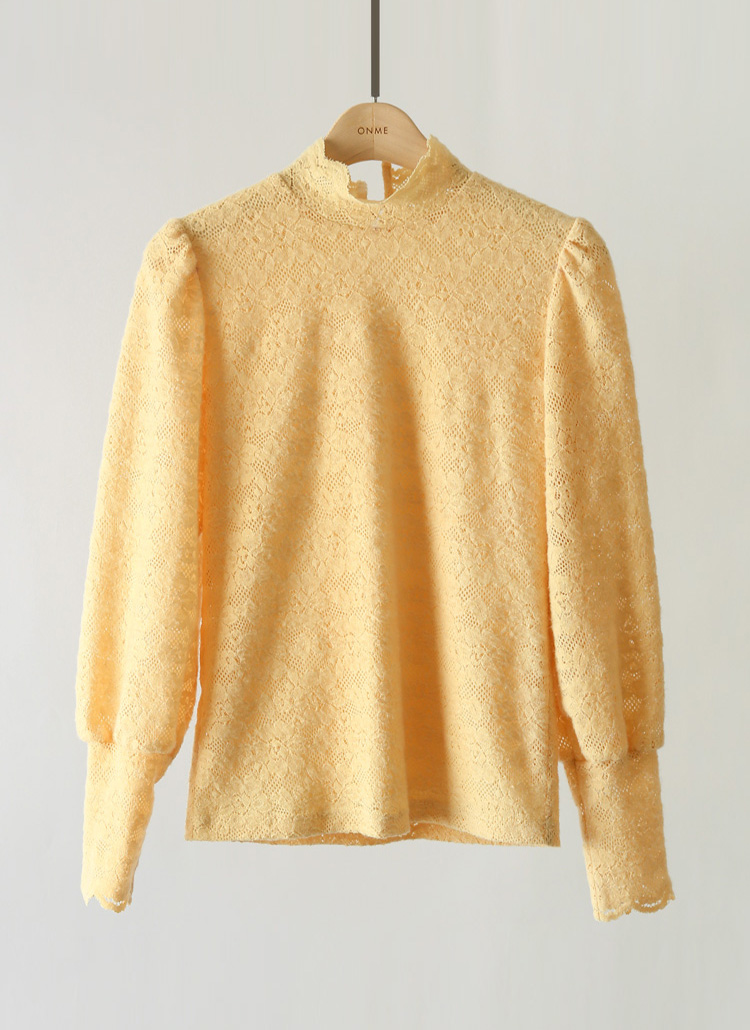 [LouisAngel] 마이 옐로 기모 플라워 레이스 스캘럽 반하이넥 블라우스