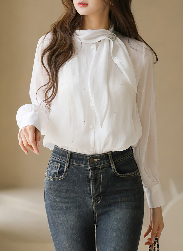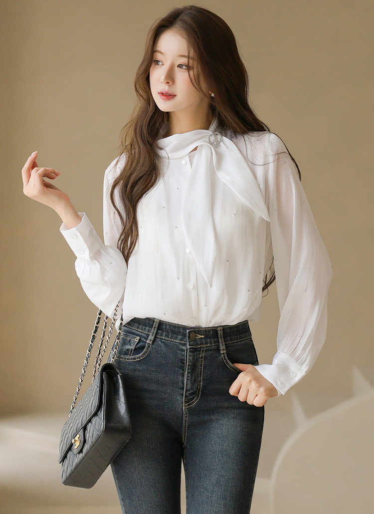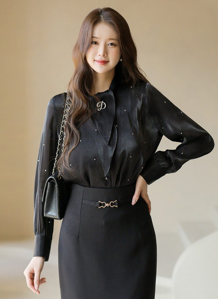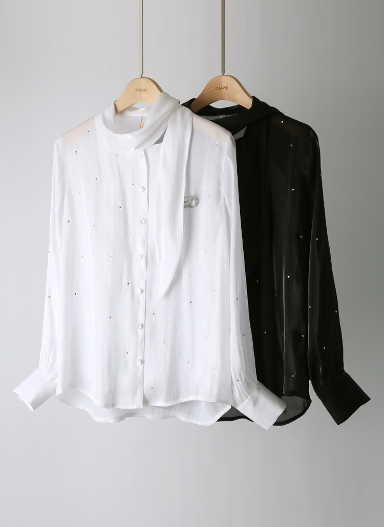 스테리 큐빅 도트 디테일 리본 타이 새틴 쉬폰 블라우스