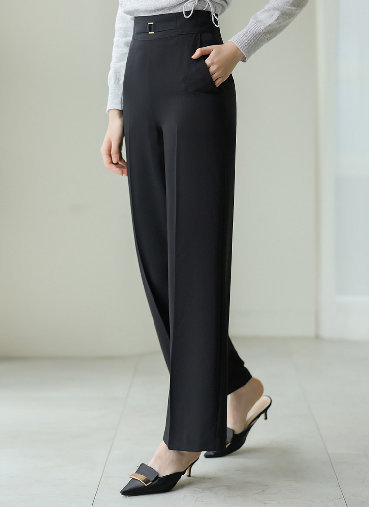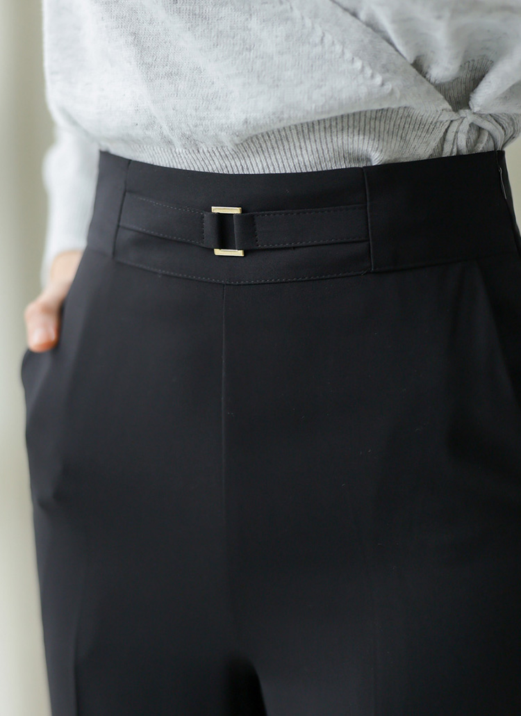 스퀘어 버클 벨티드 디테일 세미 와이드 슬랙스 팬츠