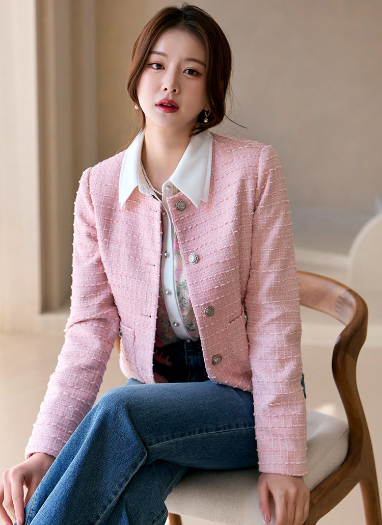 레이드 세미 크롭 스티치 트위드 노카라 자켓