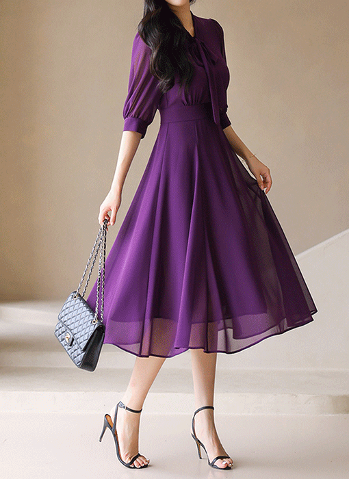 [LouisAngel] 클로렐 샤인 펄 믹스 쉬폰 벨 소매 여신무드 A라인 플레어 롱 원피스