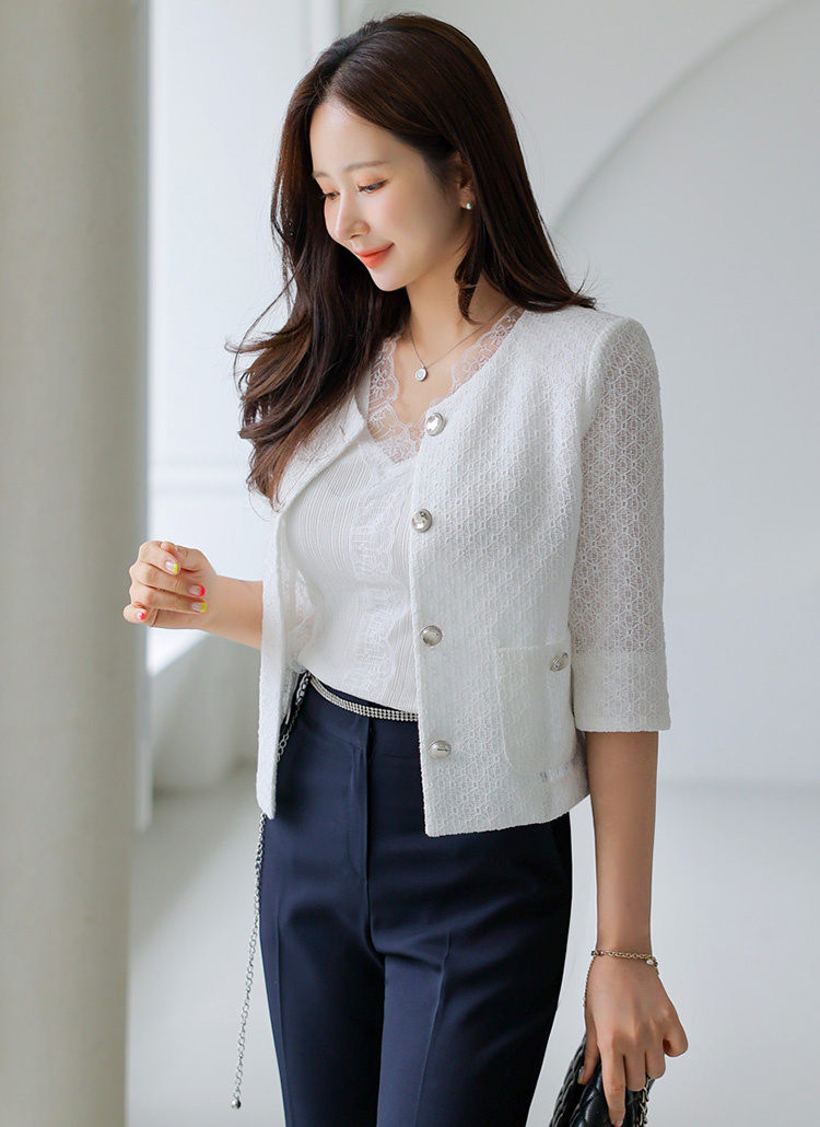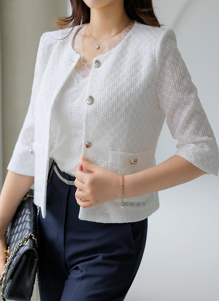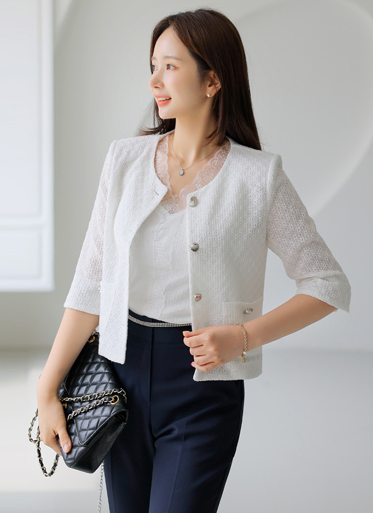비앙카 쟈가드 시스루 레이스 7부 소매 노카라 세미 크롭 자켓