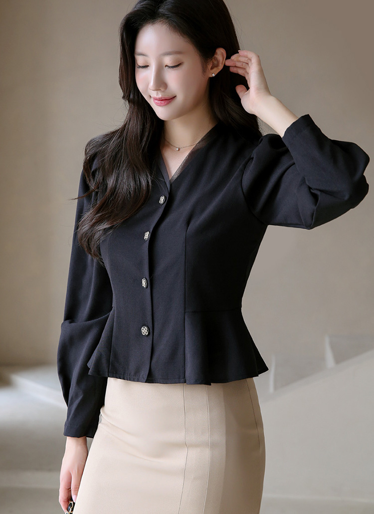 벨리오 페플럼 퍼프소매 오간자 시스루 브이넥 블라우스