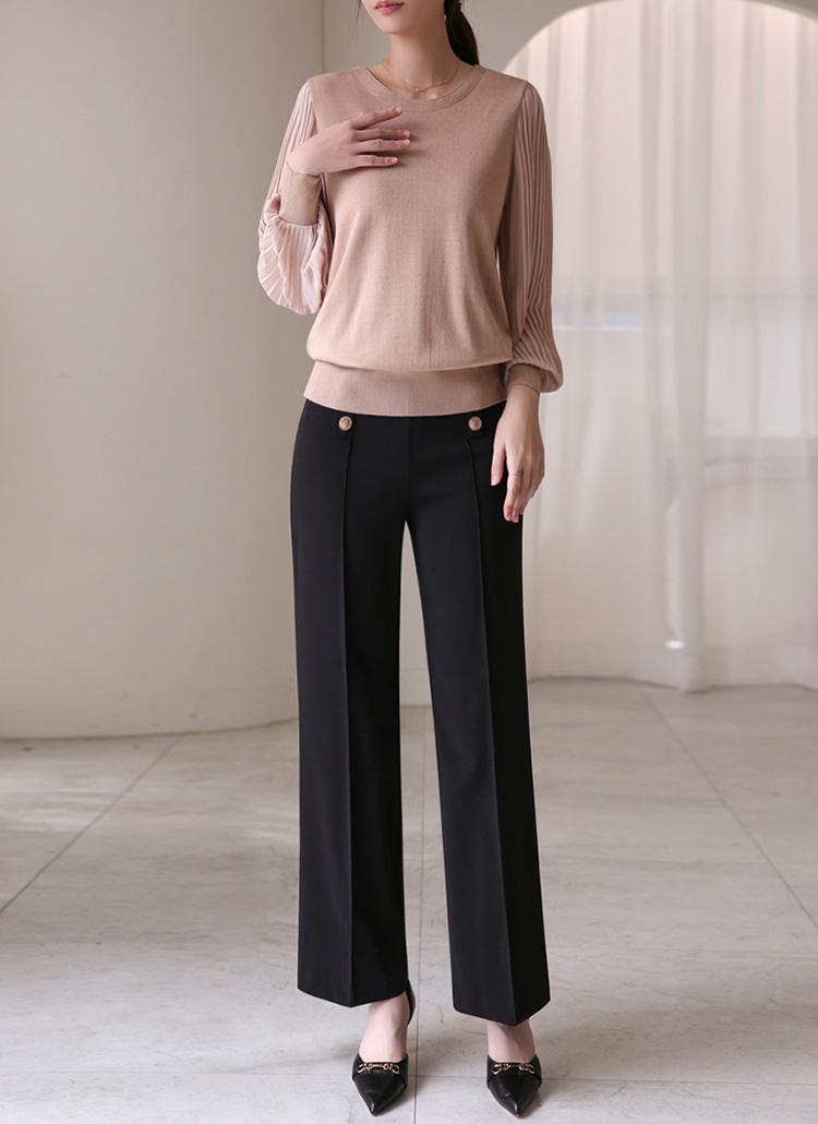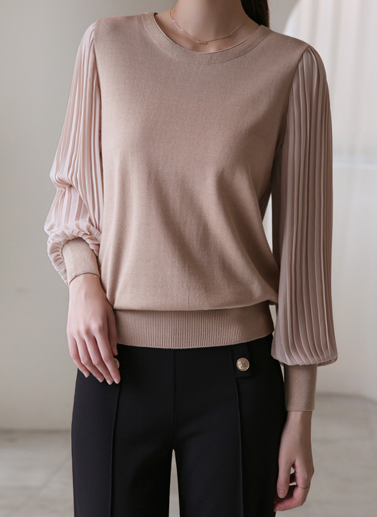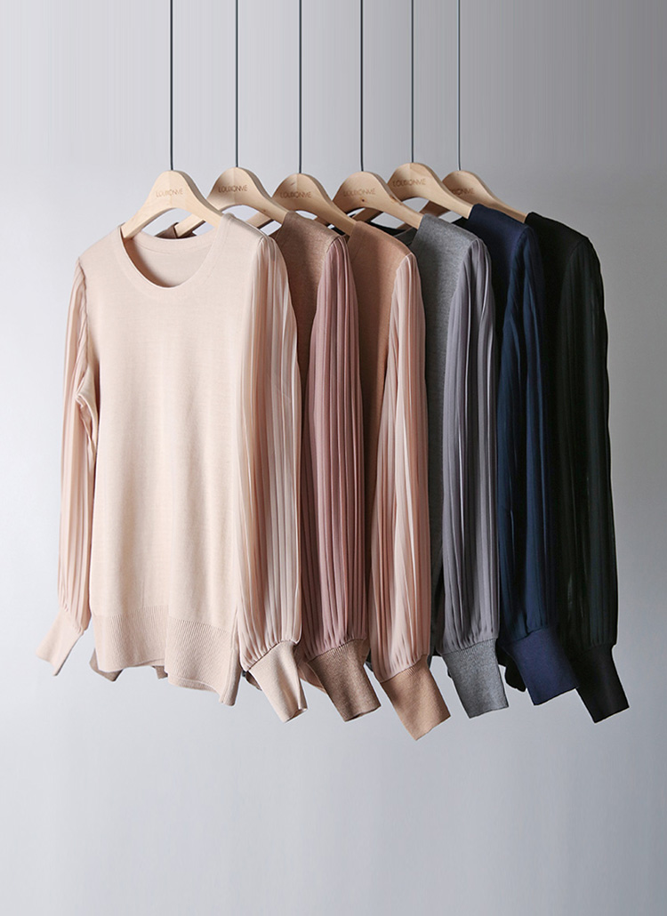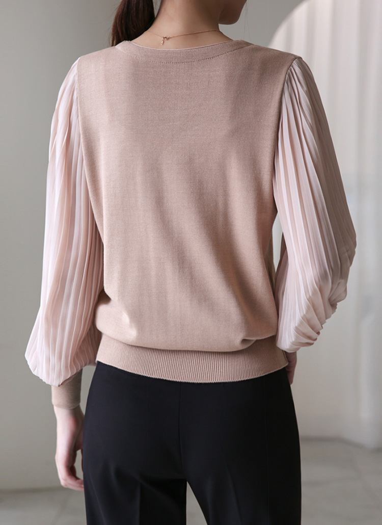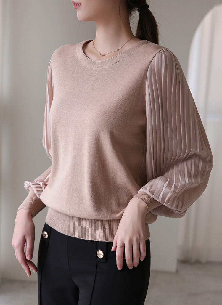 헤이즌 플리츠 쉬폰 소매 배색 니트 블라우스