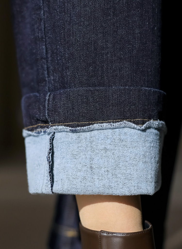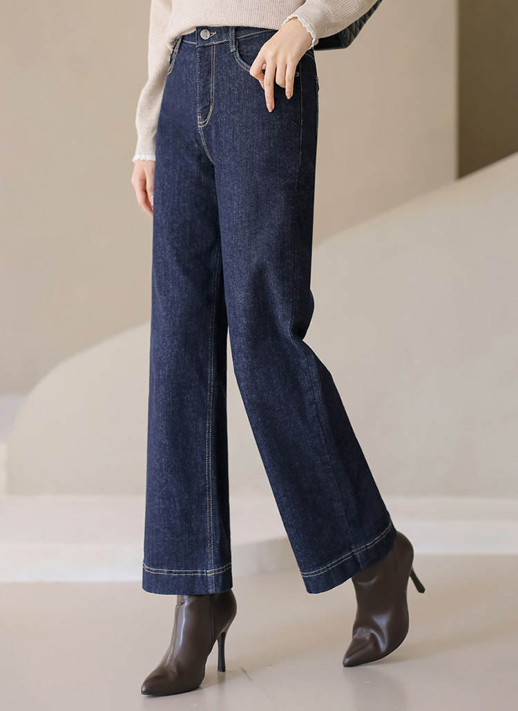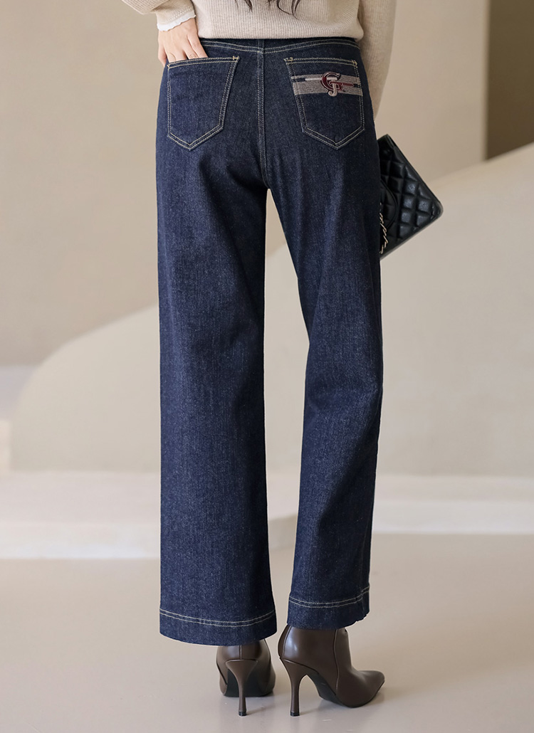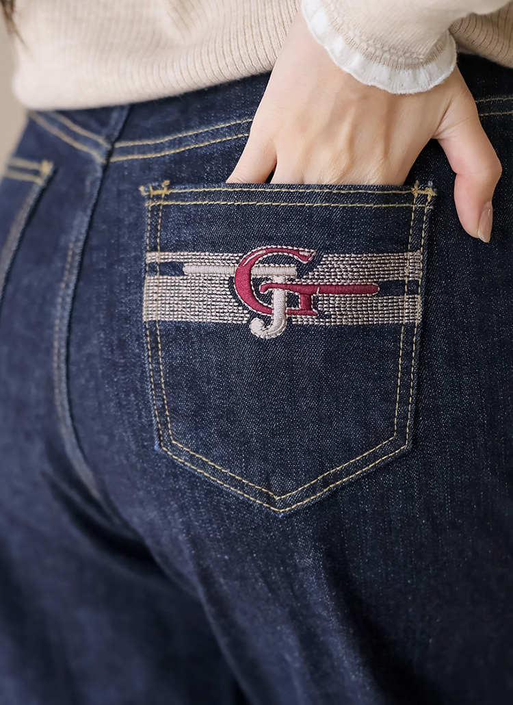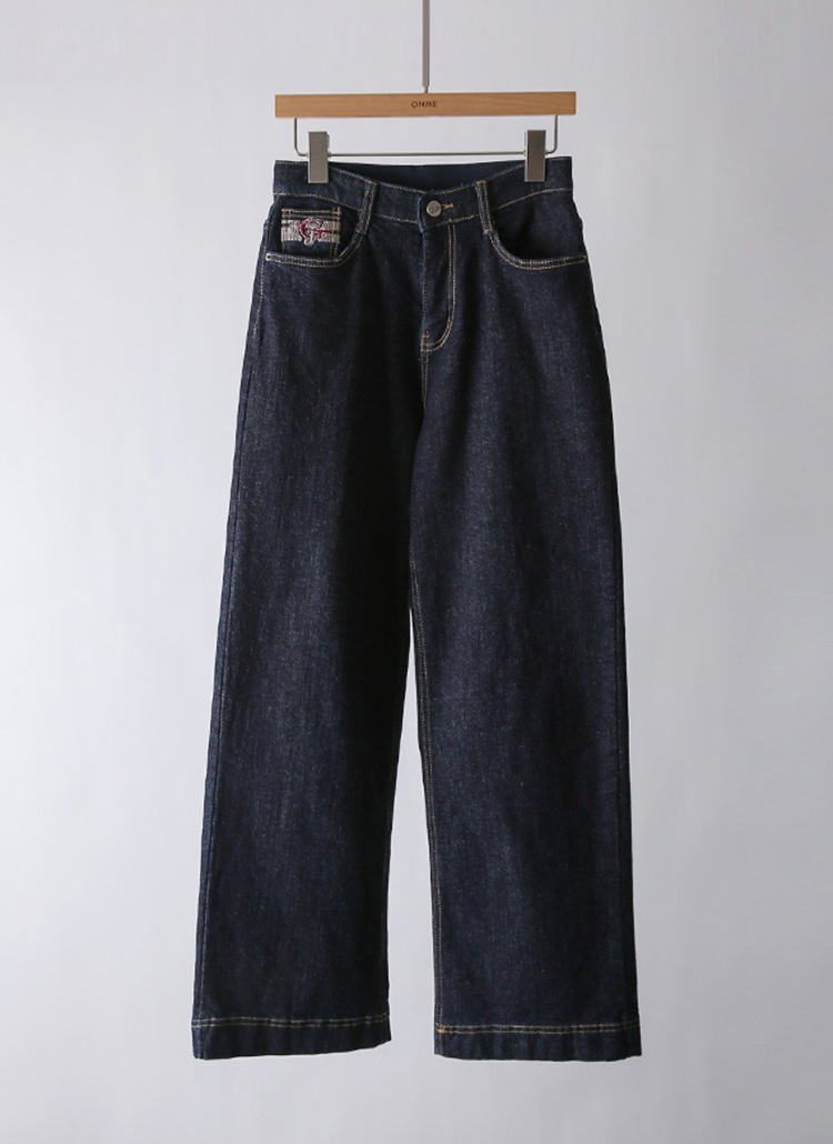 올리프 포근 속기모 레터링 자수 일자 세미 와이드 데님 팬츠