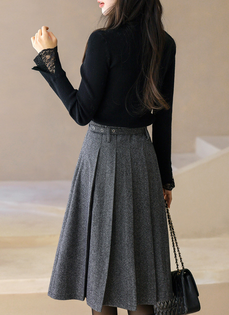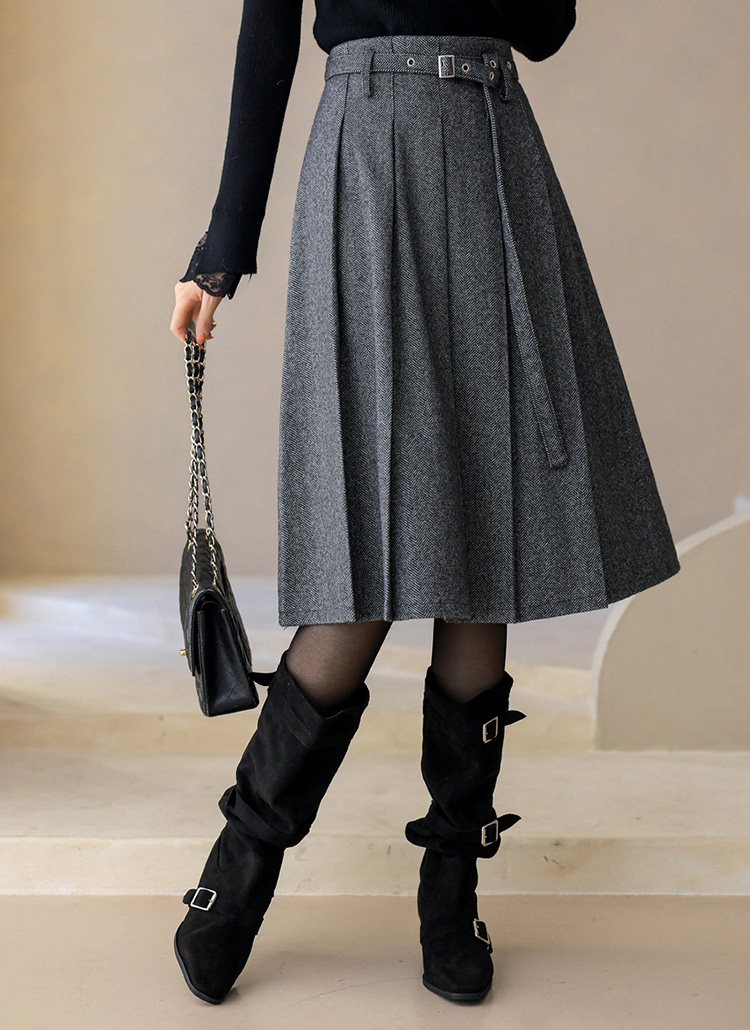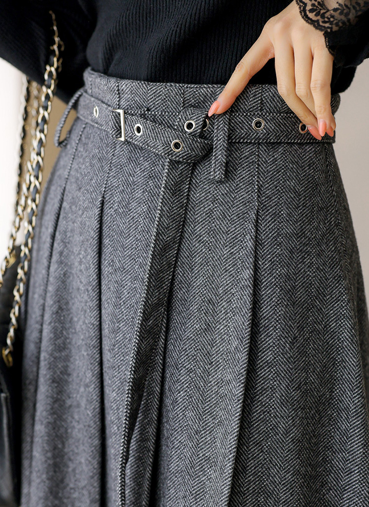 올리즈 헤링본 아일렛 벨트 SET 백 밴딩 A라인 주름 미디 플리츠 스커트