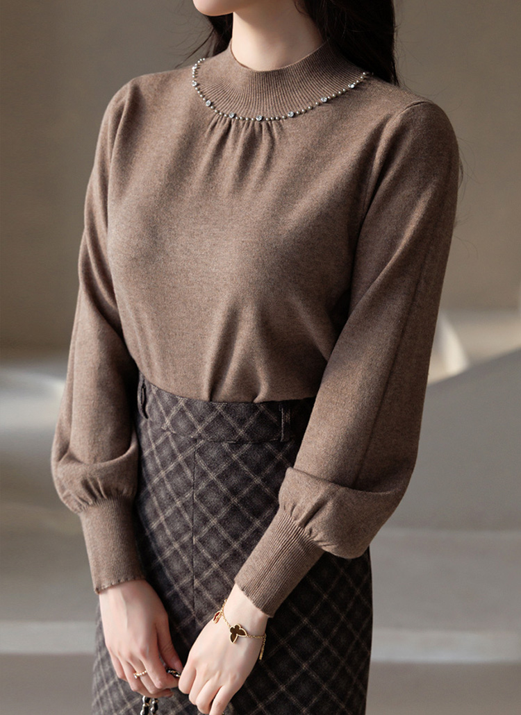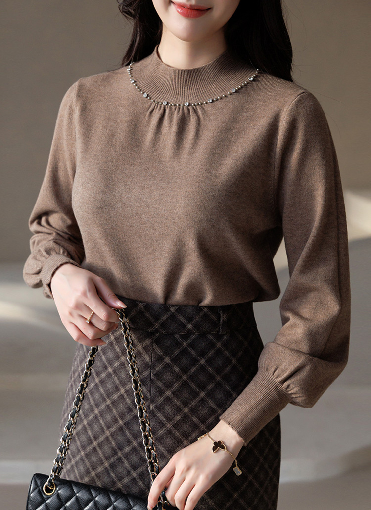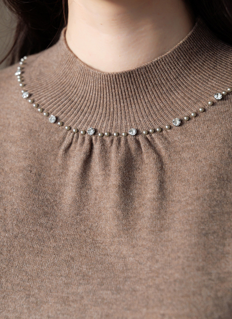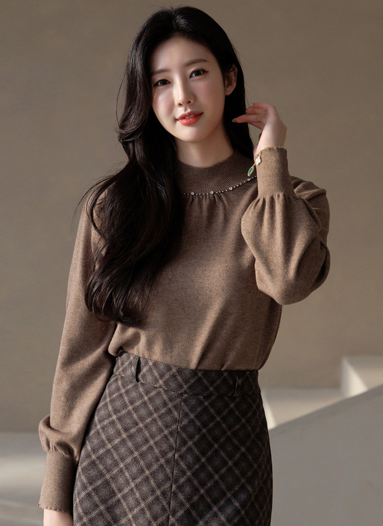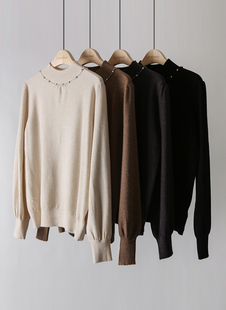 리니펄 비스코스 울 블렌딩 셔링 진주 반하이넥 퍼프 소매 니트