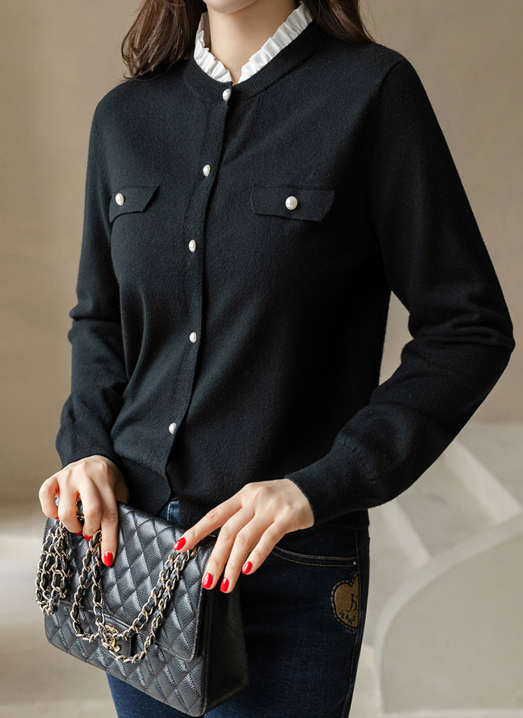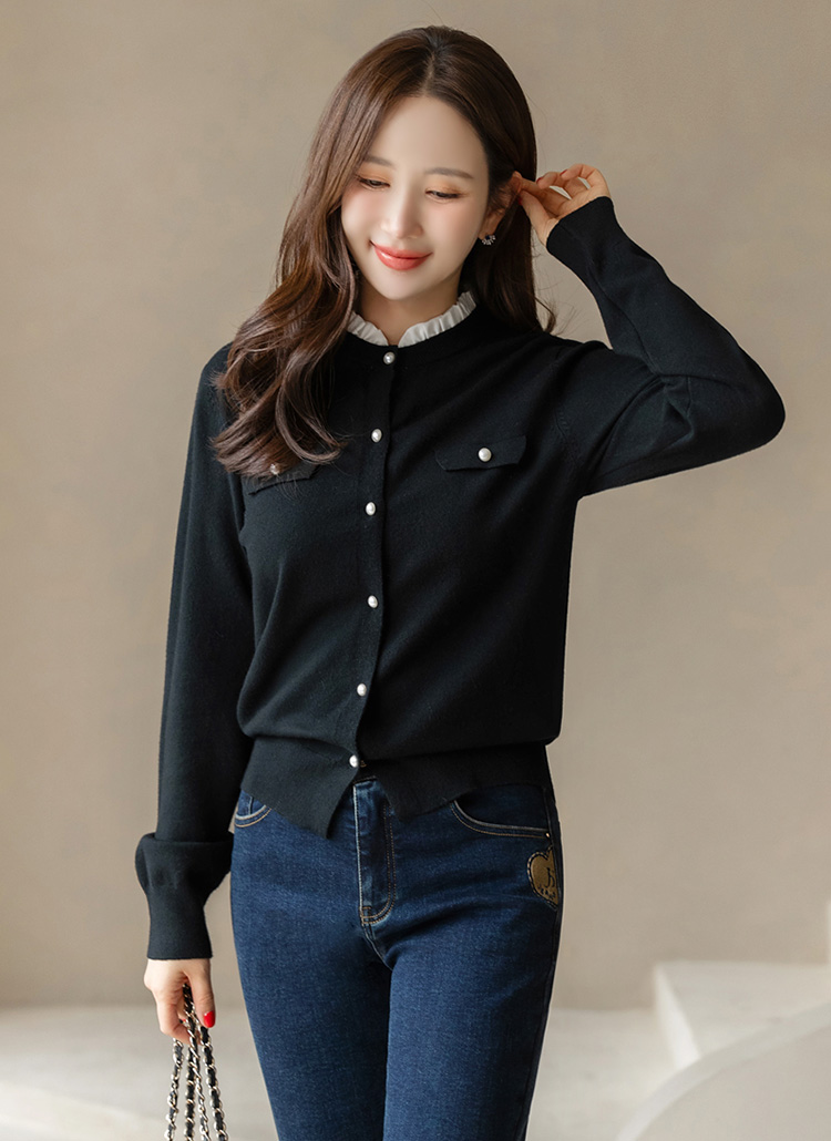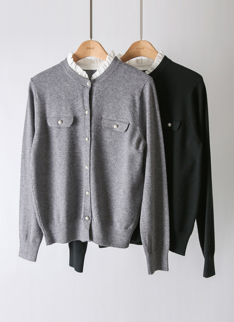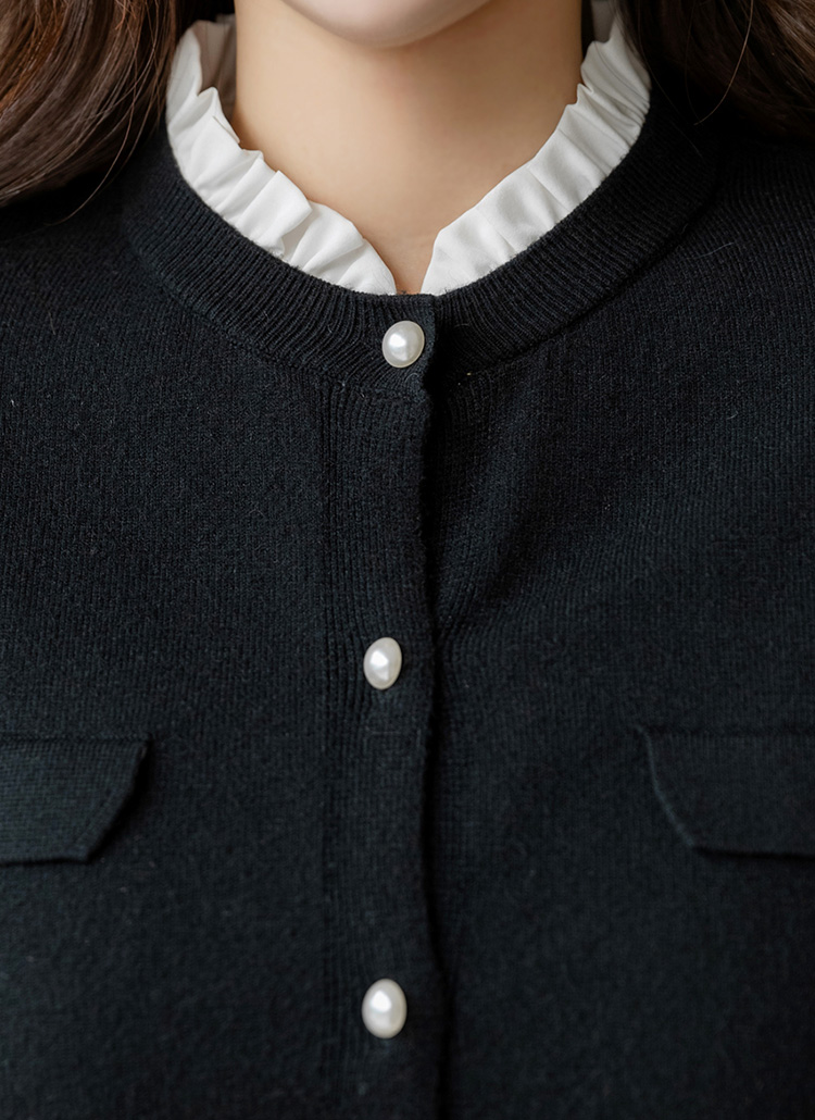 • 레이텐 미니 프릴 배색 진주 버튼 니트 가디건