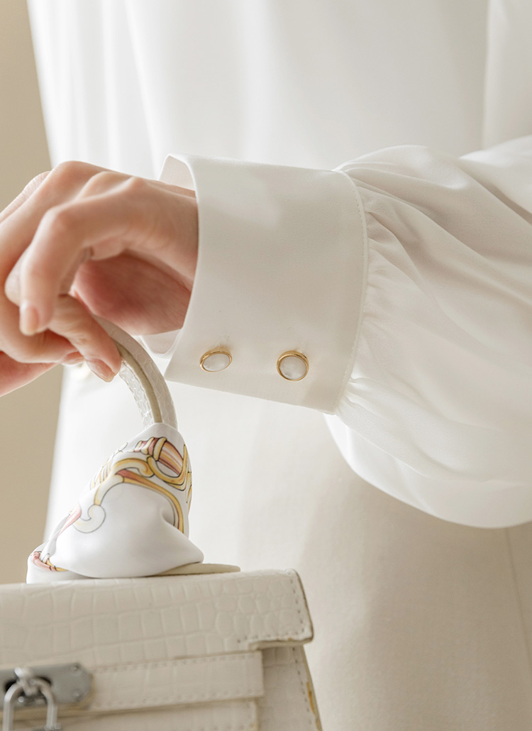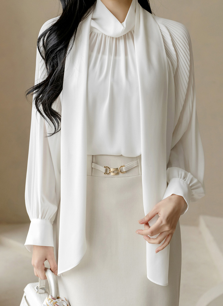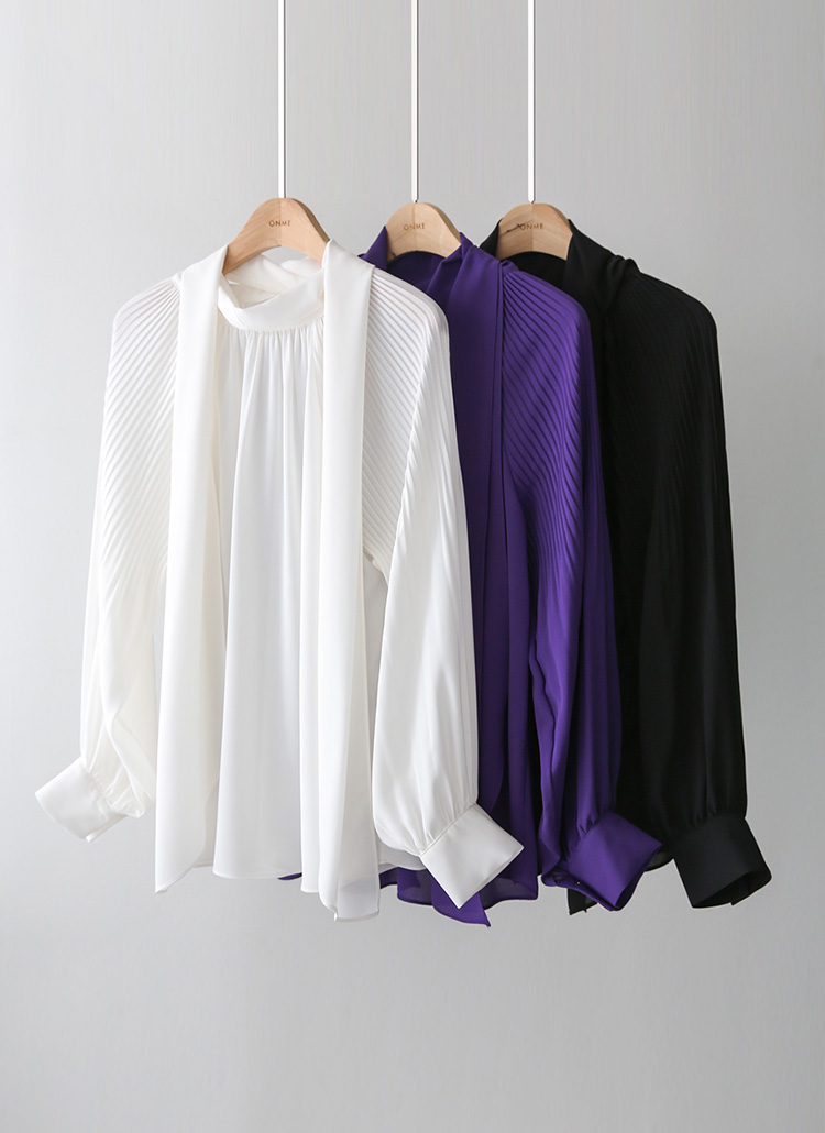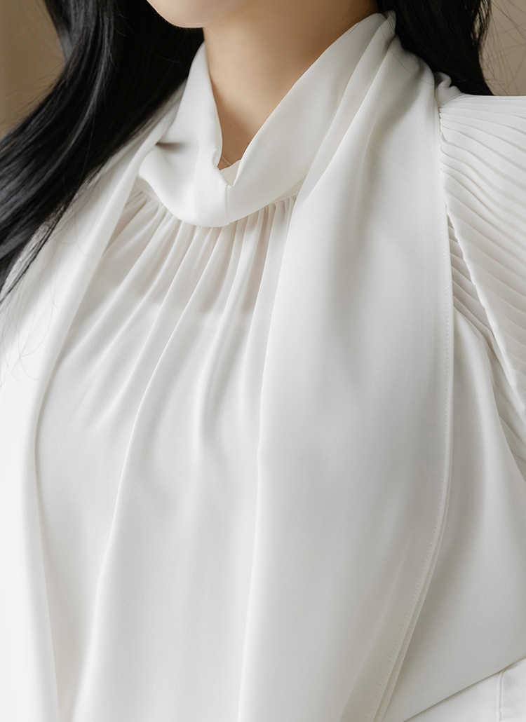 헤리므 플리츠 퍼프 소매 스카프 리본 넥 블라우스