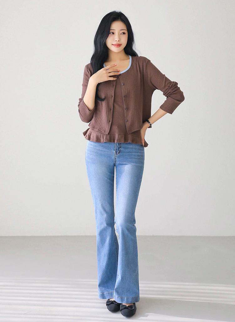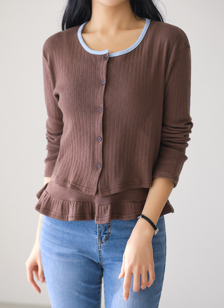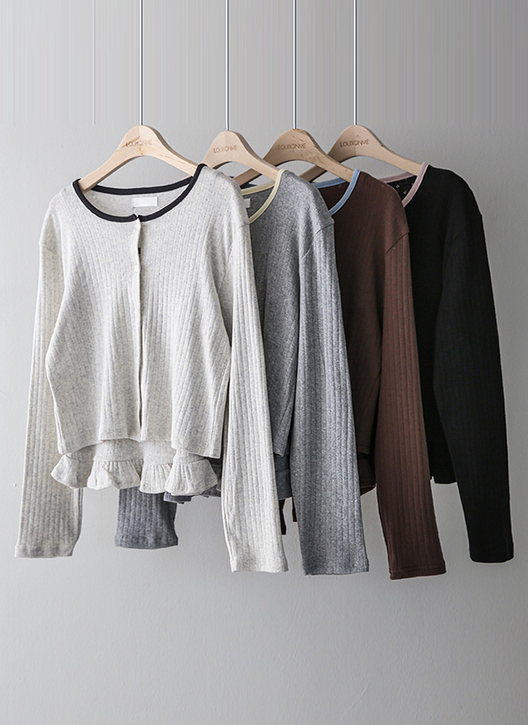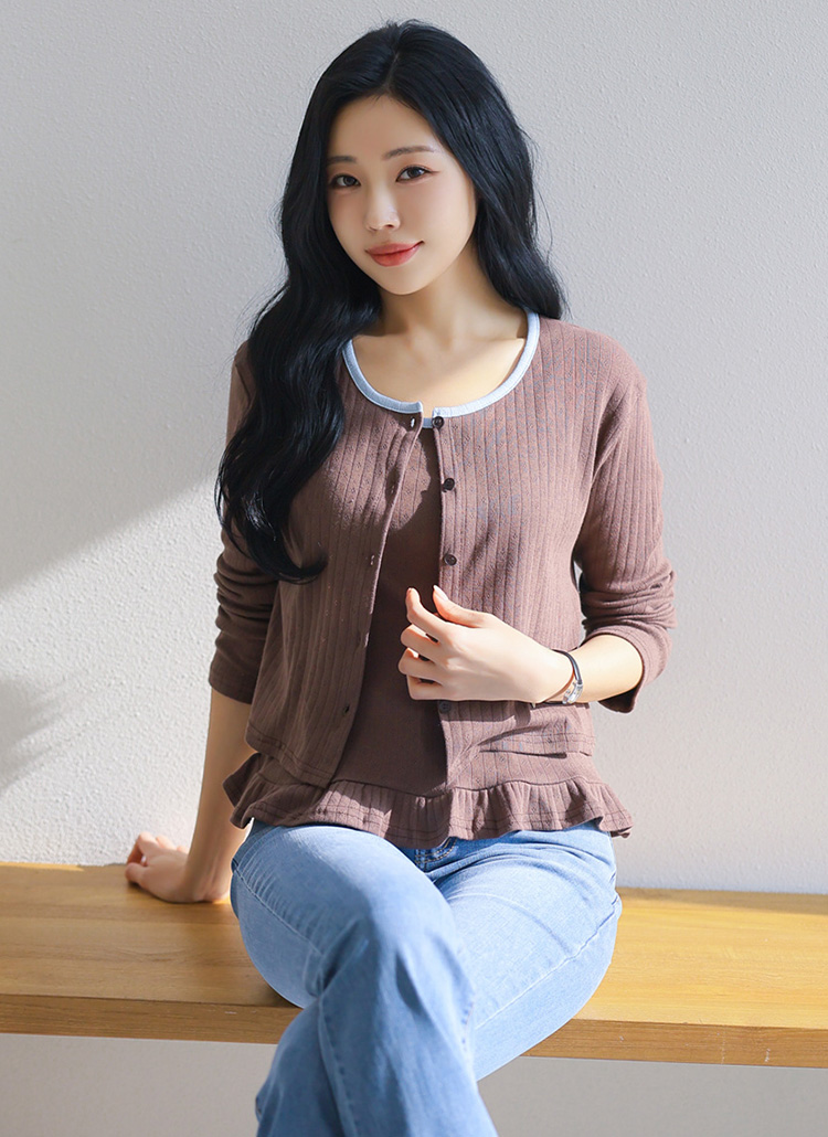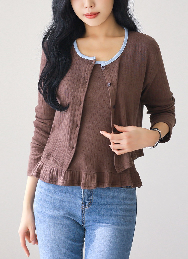 • [Theonme] 세이지 배색라인 쟈가드 프릴 레이어드 나시 가디건 세트