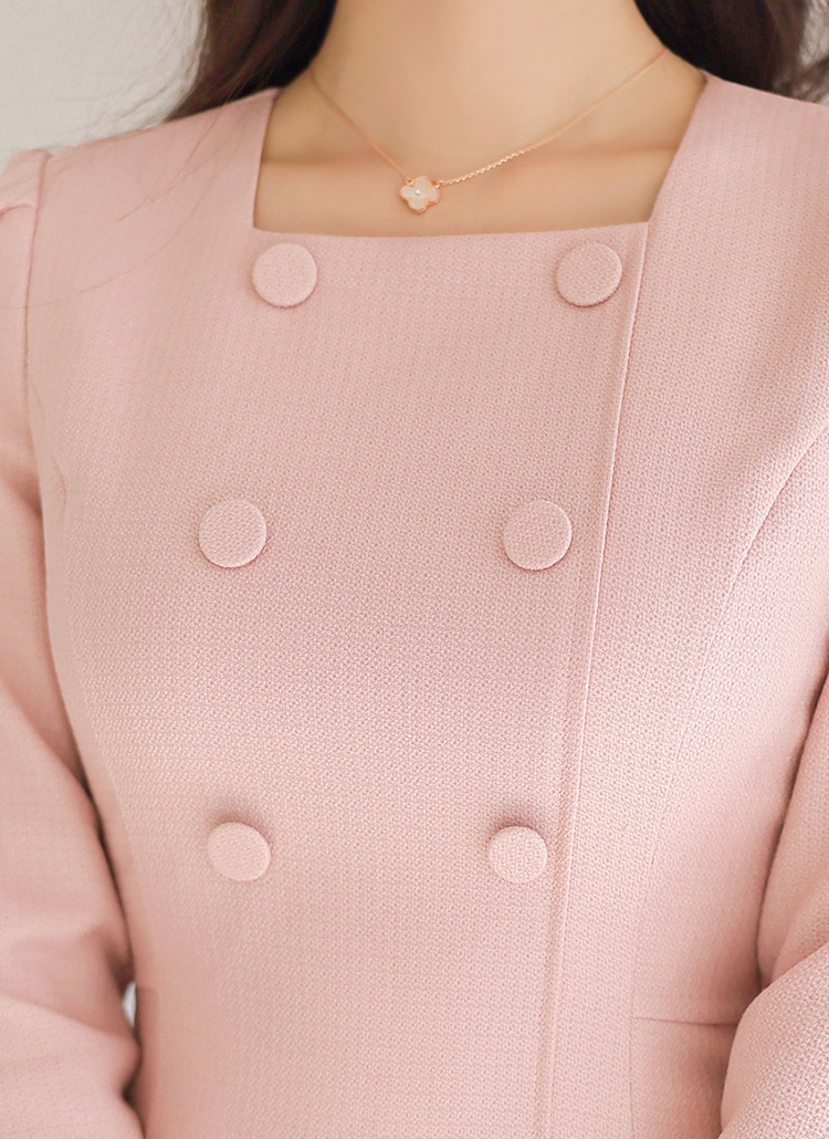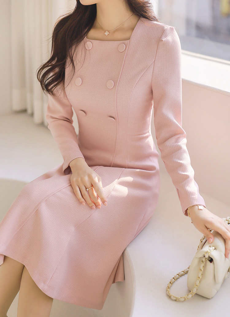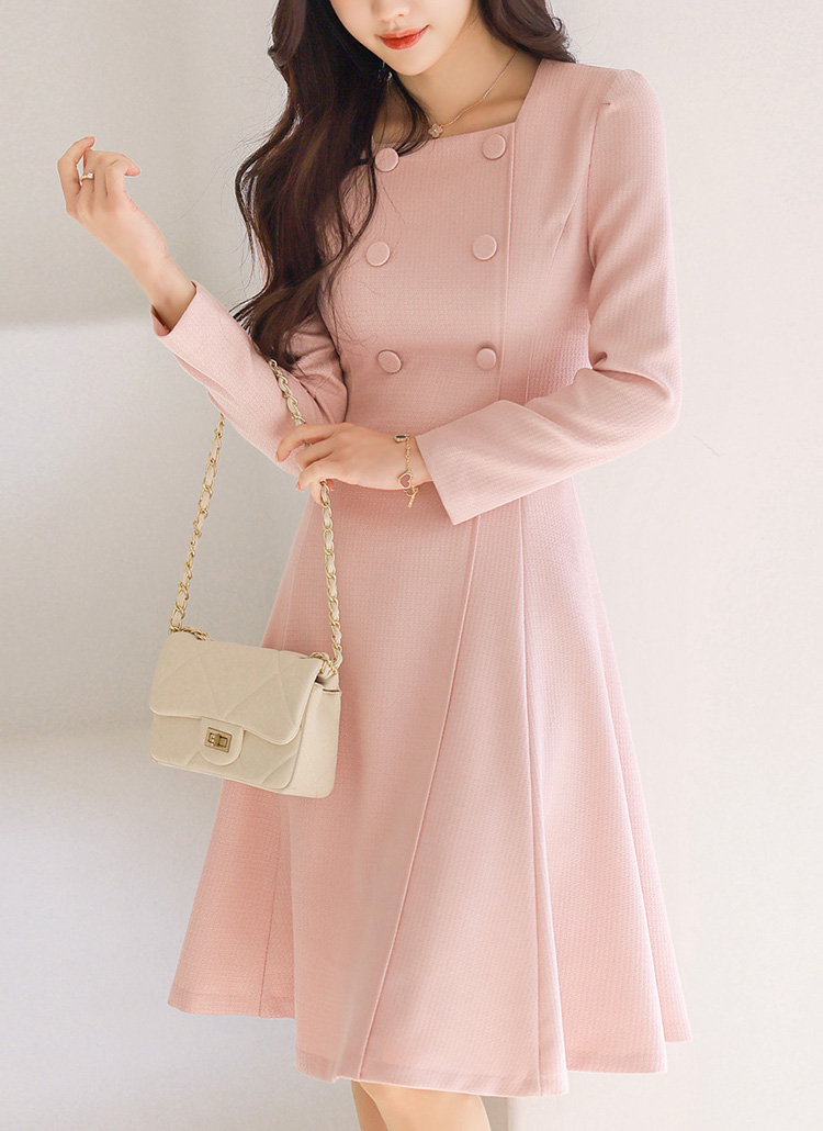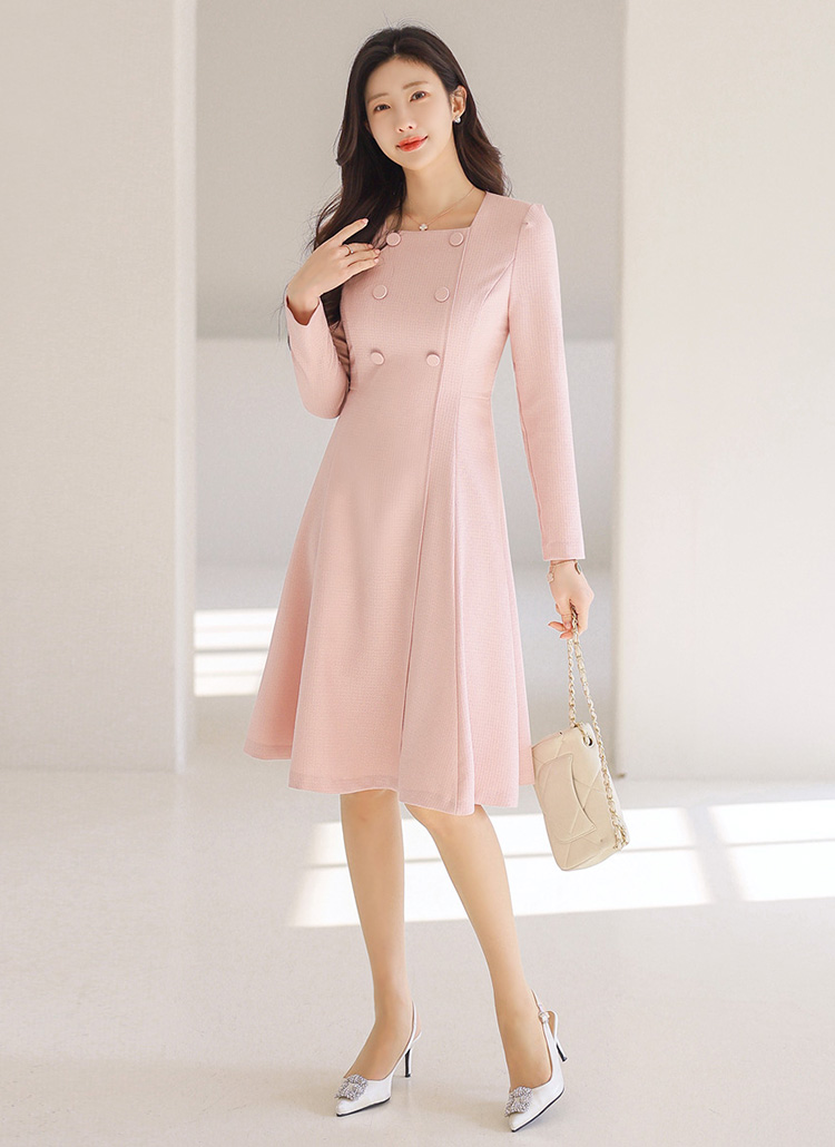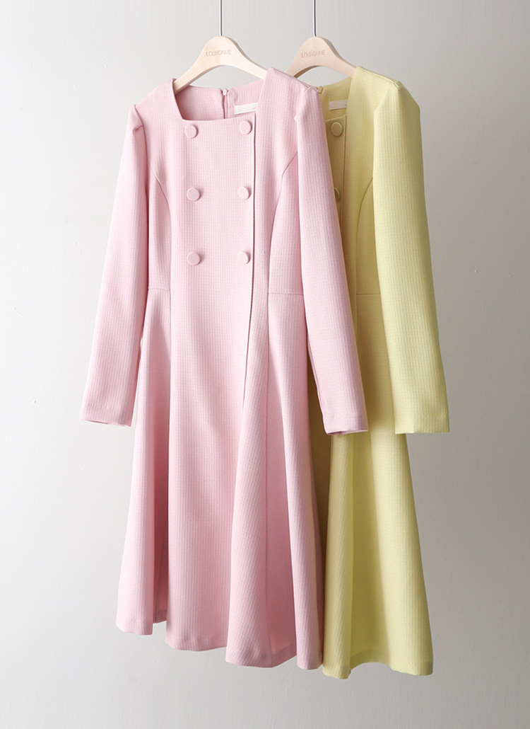 코코나 더블 버튼 절개 라인 드레시 A라인 플레어 미디 원피스