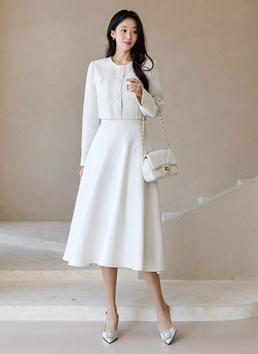 화사한 입체 텍스쳐와 여리한 쉬폰 디테일이 어우러져