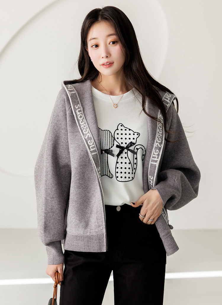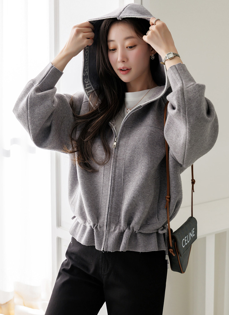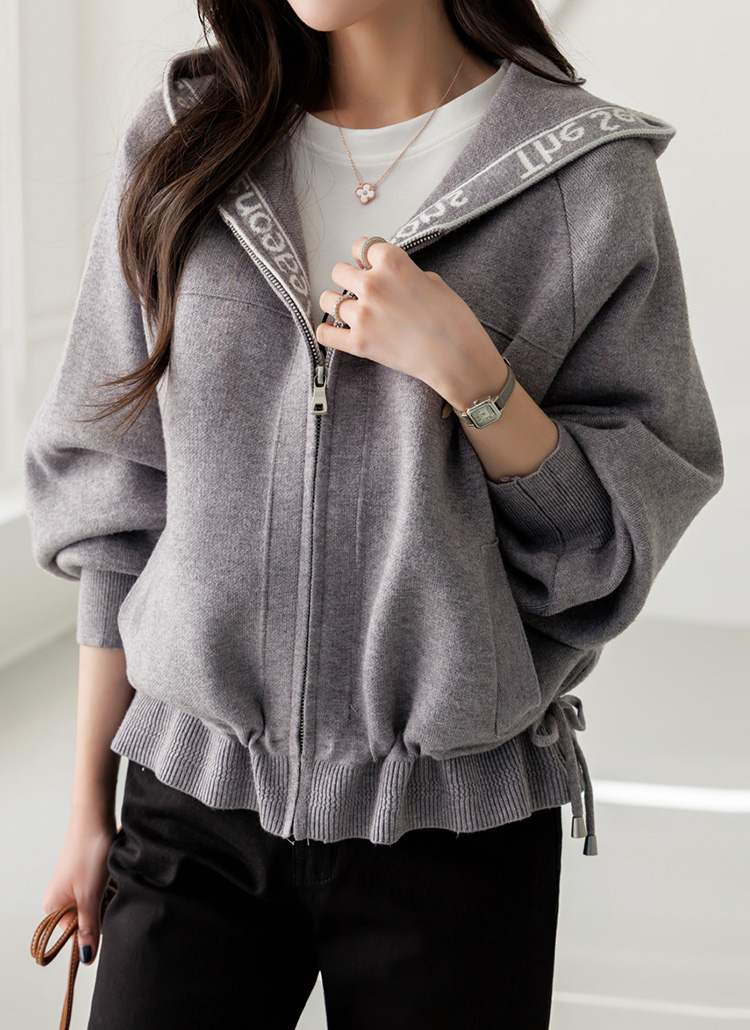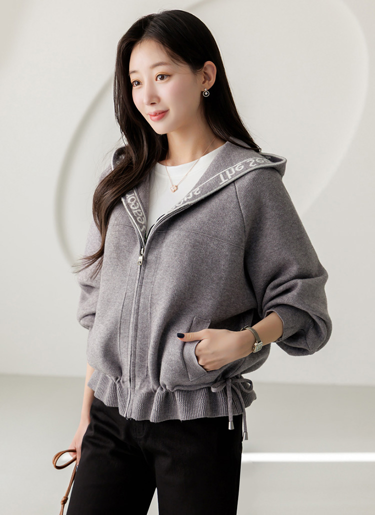 • 시즈닝 레터링 배색 밑단 스트링 니트 후드 집업 가디건