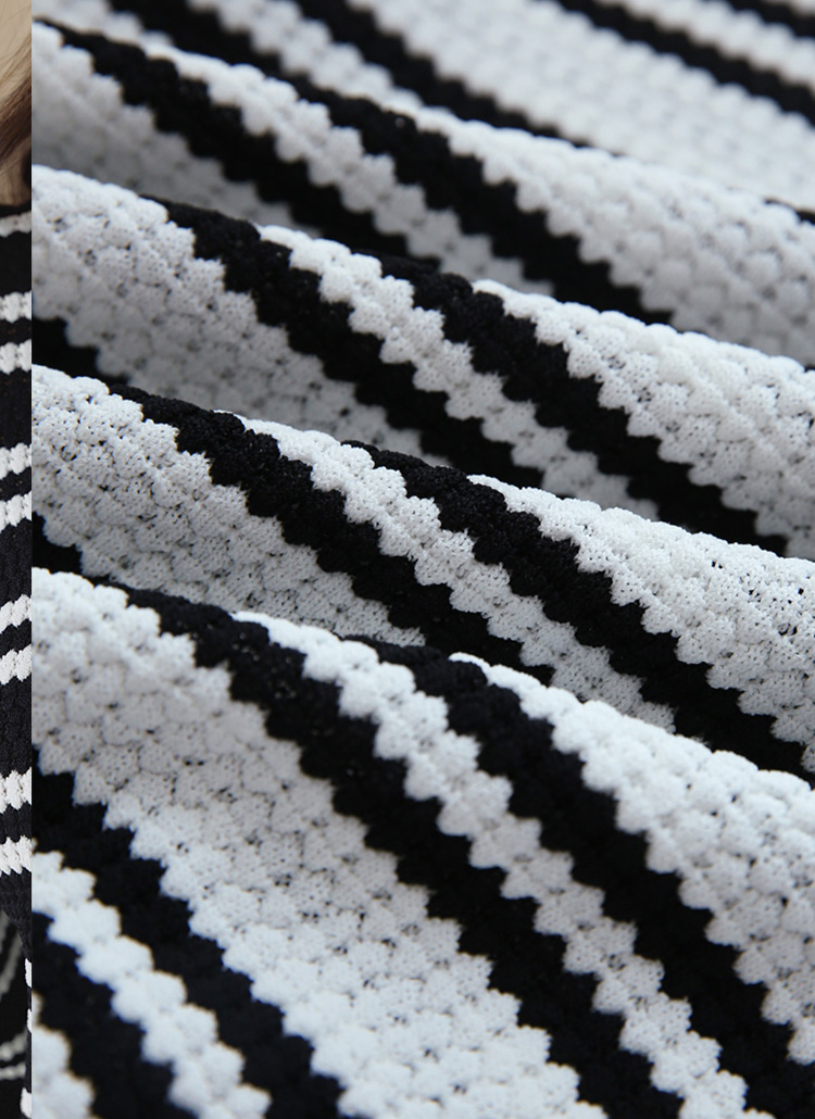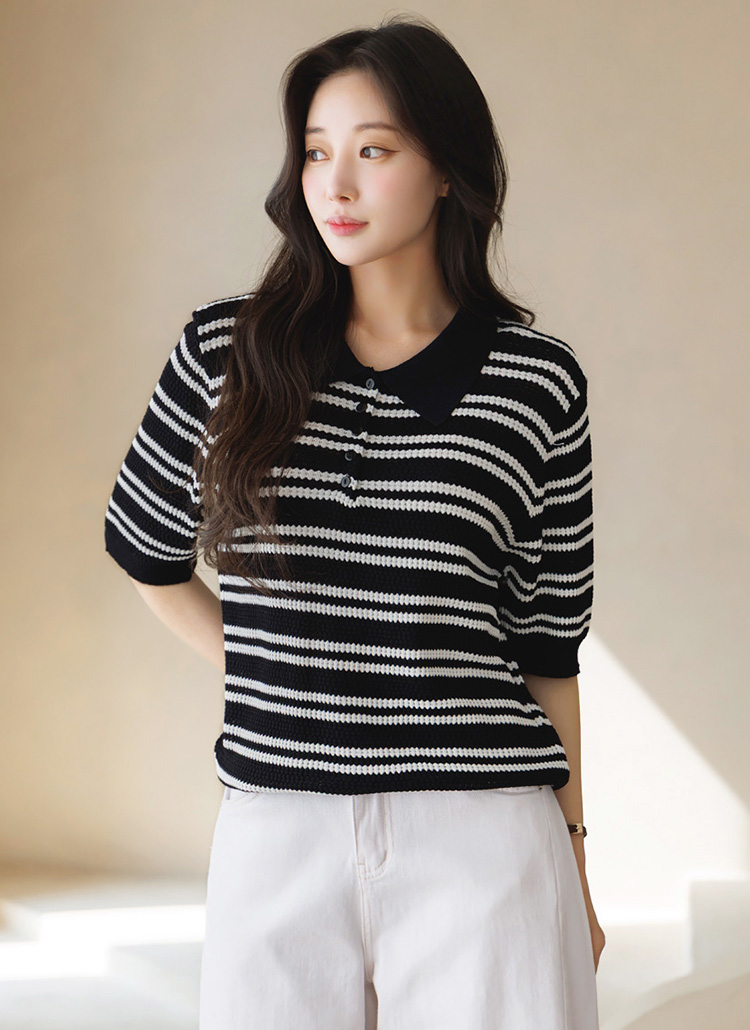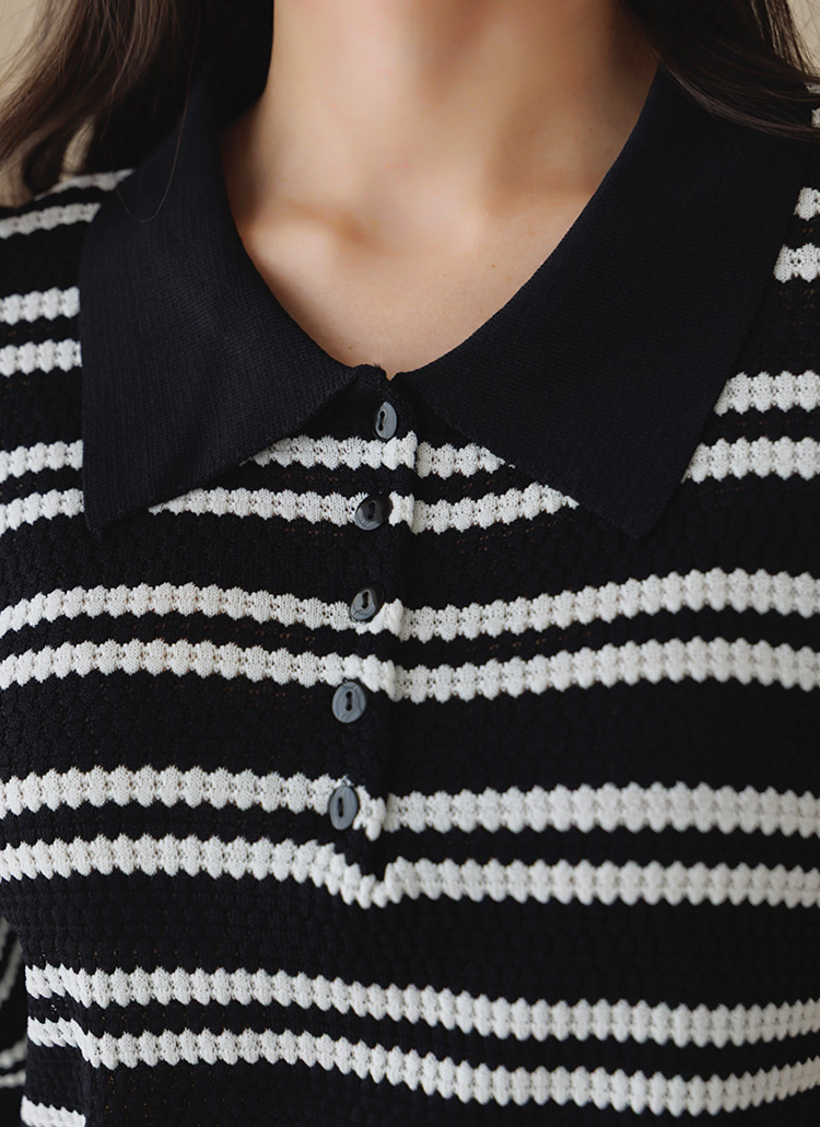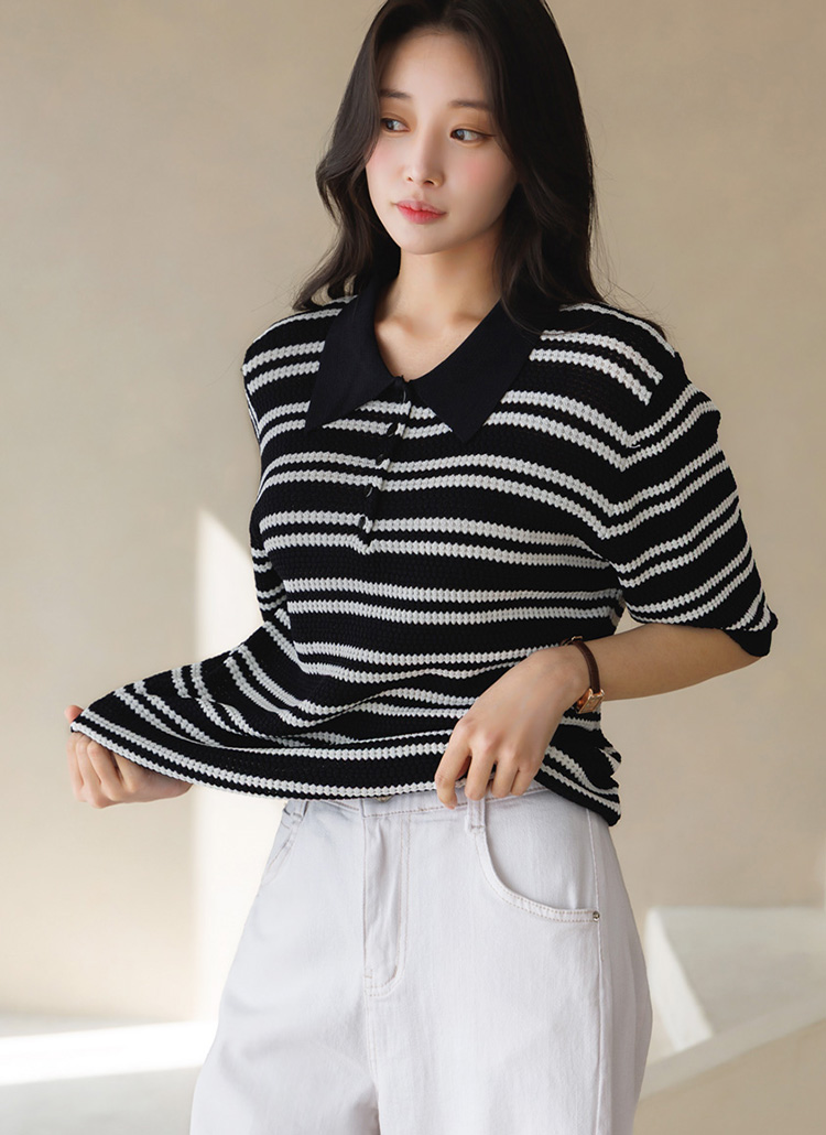 [Theonme] 루니드 비스코스 쟈가드 스트라이프 카라 5부 스카시 니트