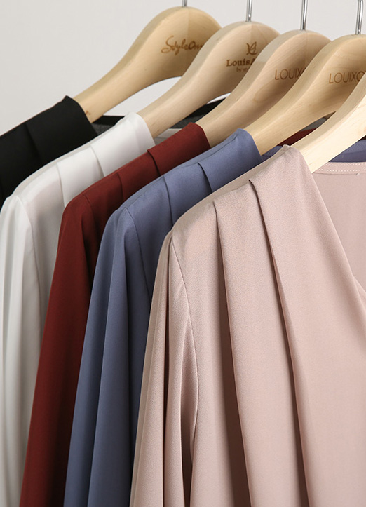 [用细褶裹身设计的雪纺衫,沿着曲线柔和流动的线条,完全遮住体型,隐隐地突显出曲线感,毫无体型负担~优雅华丽的轮廓,可以搭配各种风格。]