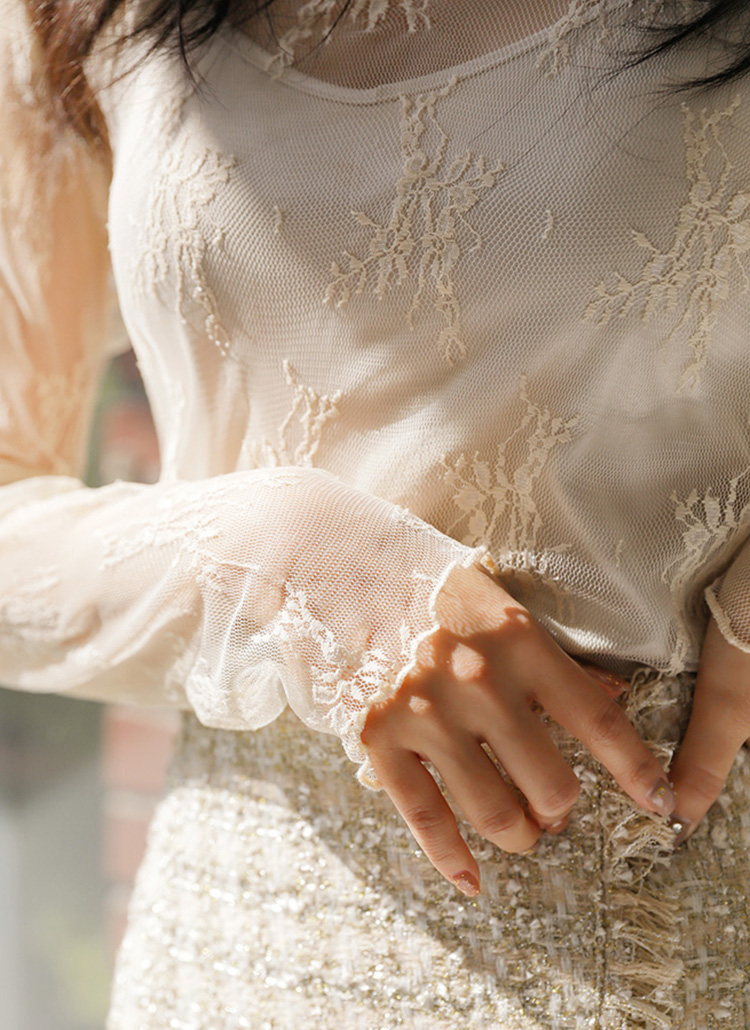 [用轮廓突显光滑线条的有女人味的蕾丝衫,刺绣细节更加充满女人味的氛围,弹性好的面料,不受体型限制,任何人都可以穿得舒适。适合与各种上衣搭配穿着。]