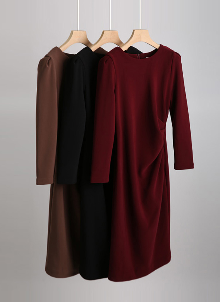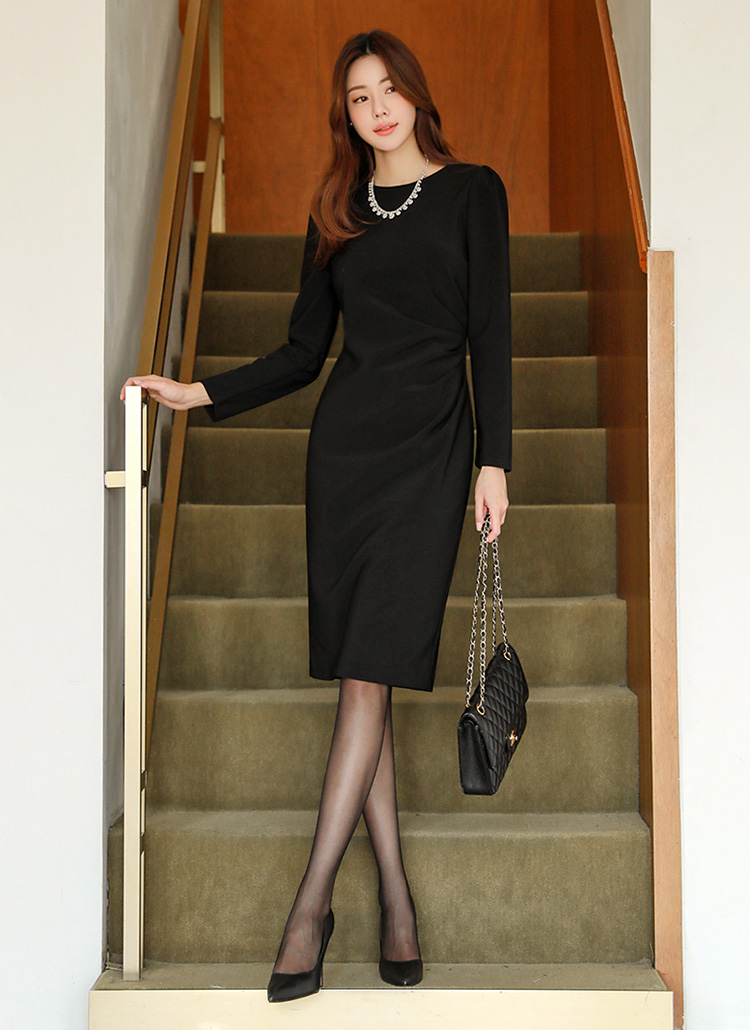 [演绎优雅淑女情调的褶皱亮点连衣裙~ 作为年末聚会装穿着,基本圆领,有显脸小的效果,加入了肩部泡泡细节,以H型风格整体裹住身体,表现得更加苗条。]