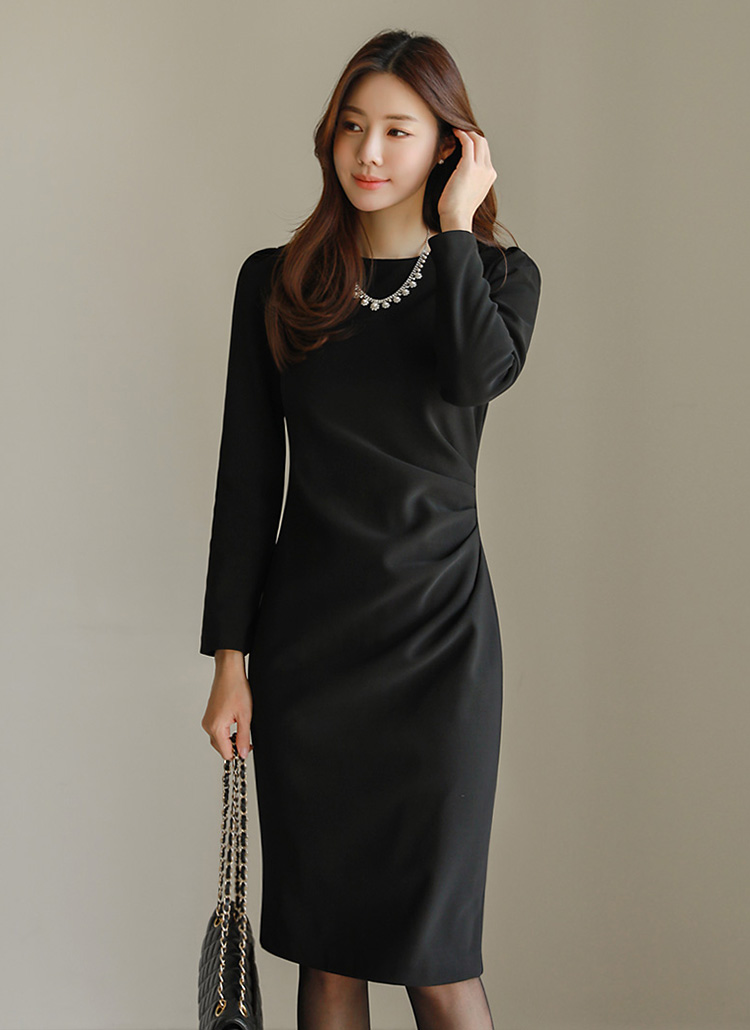 [演绎优雅淑女情调的褶皱亮点连衣裙~ 作为年末聚会装穿着,基本圆领,有显脸小的效果,加入了肩部泡泡细节,以H型风格整体裹住身体,表现得更加苗条。]