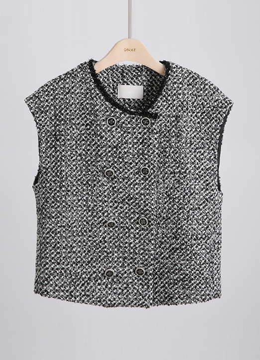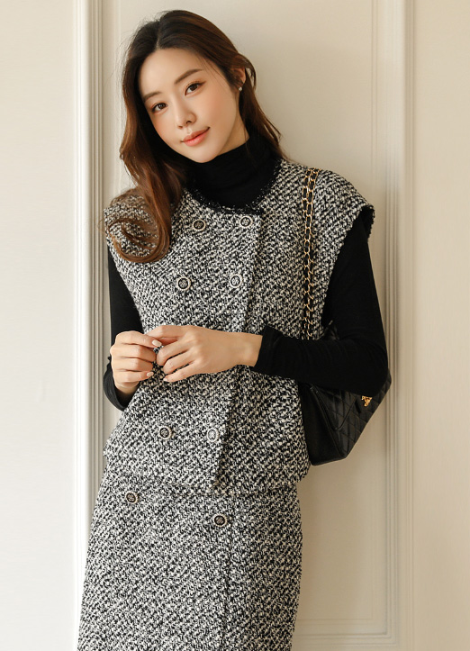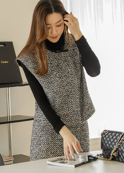 [用结实的粗花呢面料制作,以干练的版型,完成高档氛围的马甲。圈线条很宽松,与高领搭配起来也方便穿着。经典感性的纽扣完成了点缀,宾客装,聚会装等根据场所搭配:)]