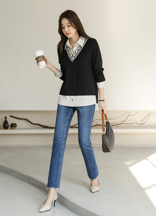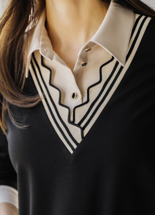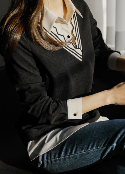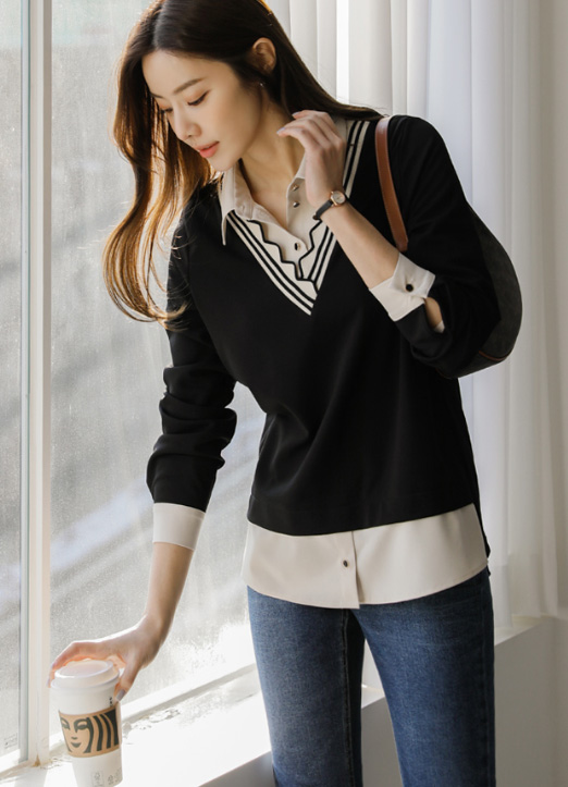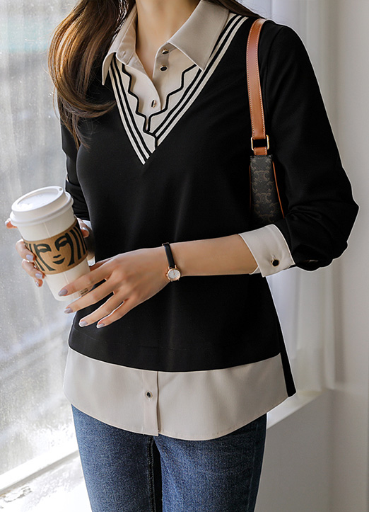 [雪纺衫和针织T恤拼接,像层叠式设计的感觉,路易斯天使特别制作的雪纺衫:) 以自然的版型,针织部分用V配色,成为有个性的亮点,日常又舒适的版型!]