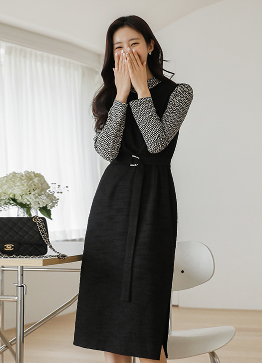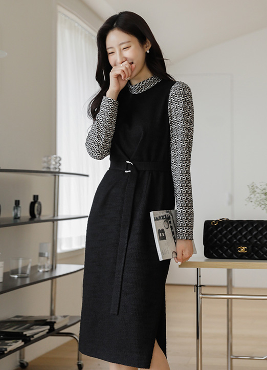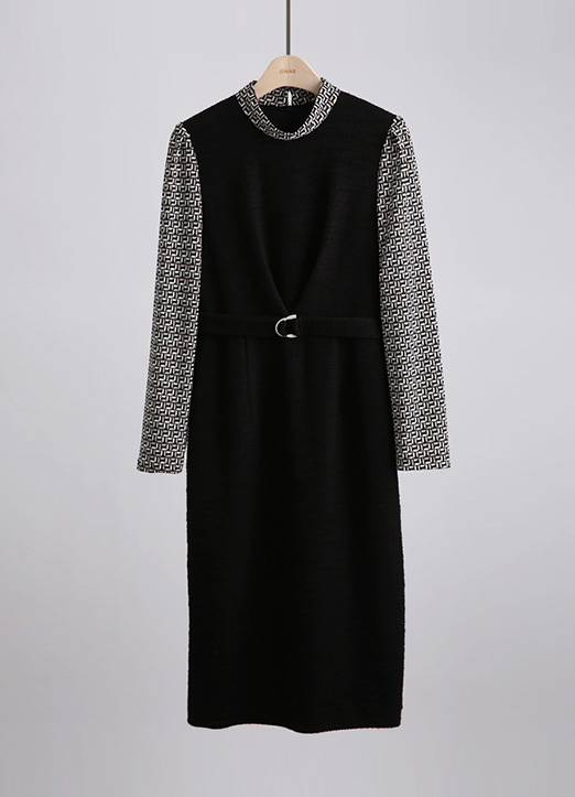 [高档且现代感十足的印染配色,D环带再抓住一次腰部线条,打造苗条的版型,上衣是黑色配色,在视觉上也演绎出纤细的线条,稍微盖住膝盖的中长款,可以试穿得端庄。]