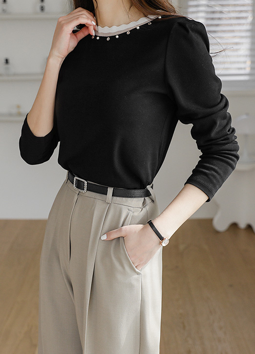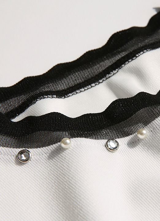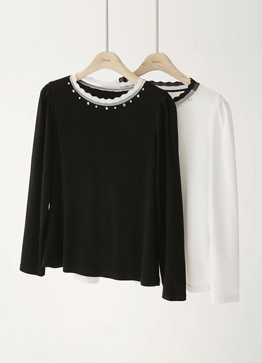 [简约的款式,只在领口上加入了点缀设计,不夸张的干练帅气!波浪线条的末端,加入了透视的触感,更适合季节感的配色设计!沿着线闪闪发光的材质,更加光彩照人!]