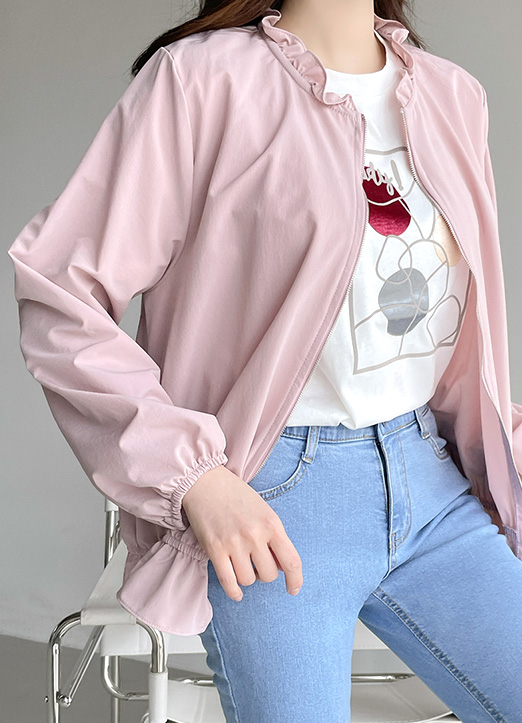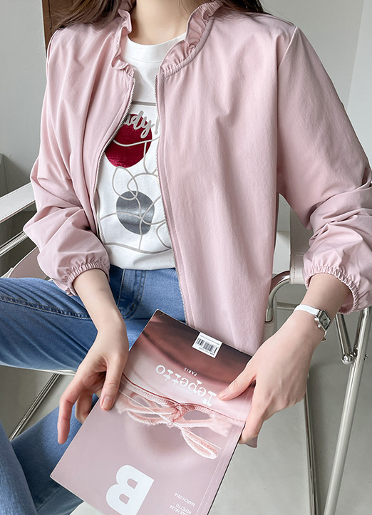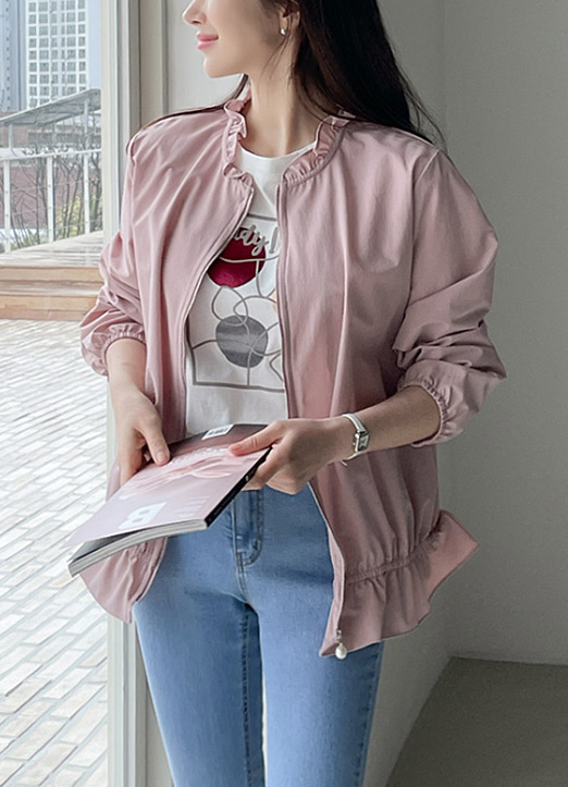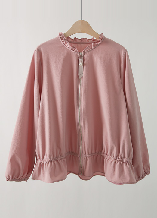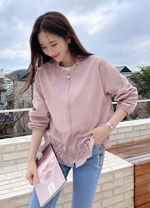[荷叶边细节的珍珠纽扣亮点,沙沙的材质感,领口和底端线条以荷叶边设计,成为可爱的亮点,下摆松紧收腰版型,展现可爱的轮廓~ 4款颜色,推荐一定要收藏一件!]