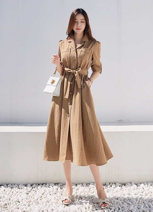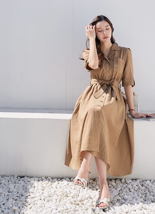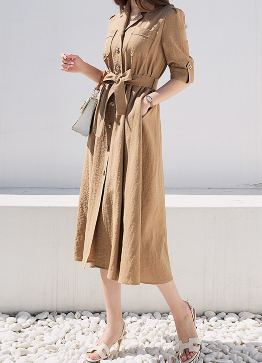 [Louis Angel]五分袖亚麻腰带连衣裙