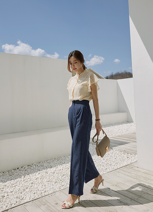 차이나 넥에 스판이 혼방된 레이스 원단으로 제작된
