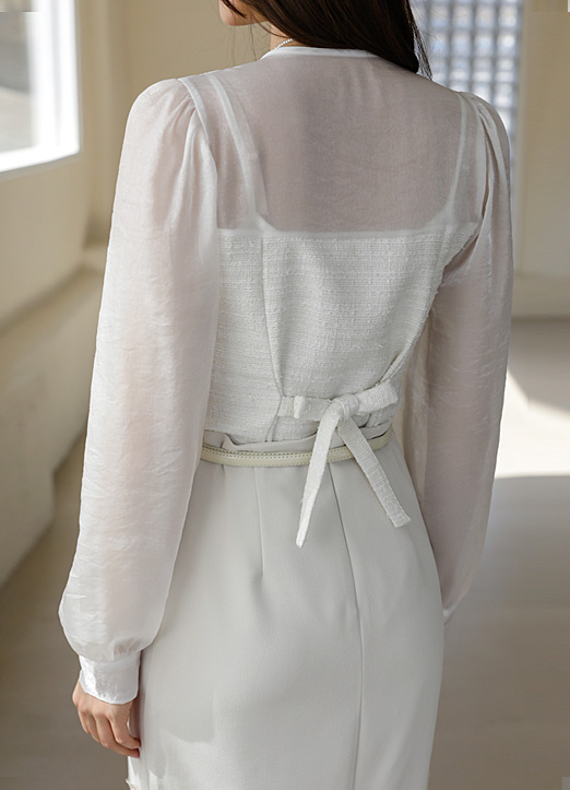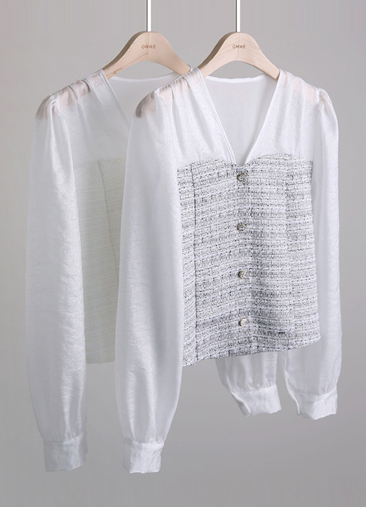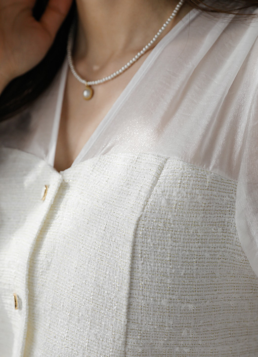[隐隐有光泽感的透明雪纺设计,带有珠光感的粗花呢配色,尽显优雅魅力的雪纺衫。隐隐性感的感觉~可以毫无负担地穿着,展现丰满又纤细的美丽轮廓。]