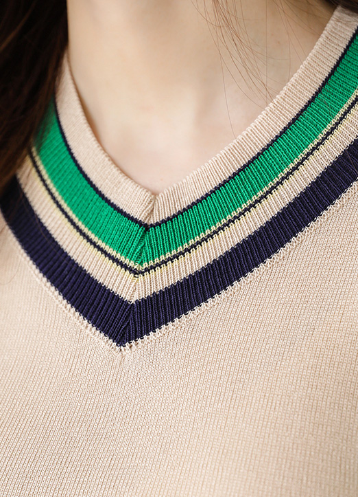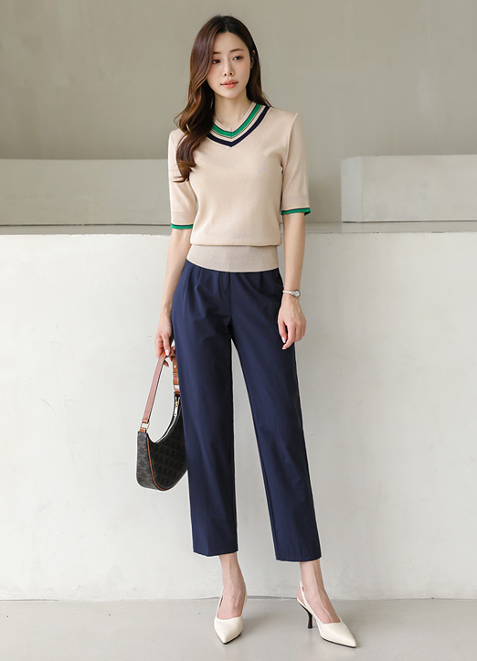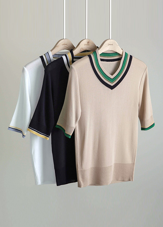 [领口配色感很有魅力的配色针织T恤,以干练的配色感的V领线条,轻巧的材质,5分长度的袖子遮盖胳膊上的肉,可随意地搭配穿着!]