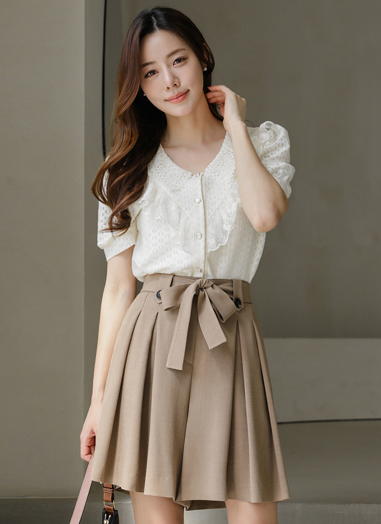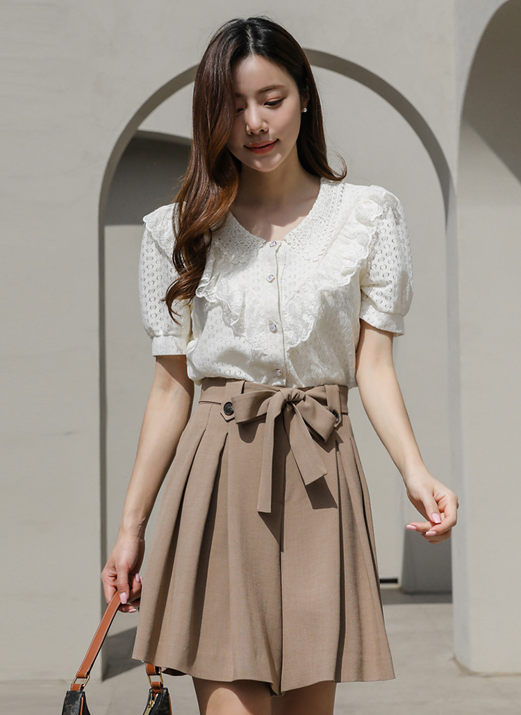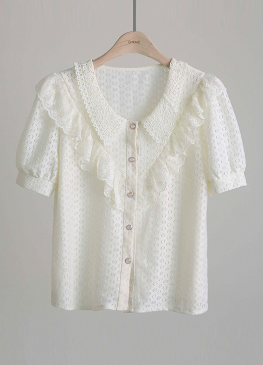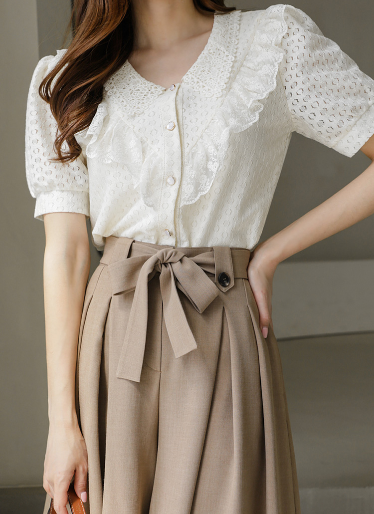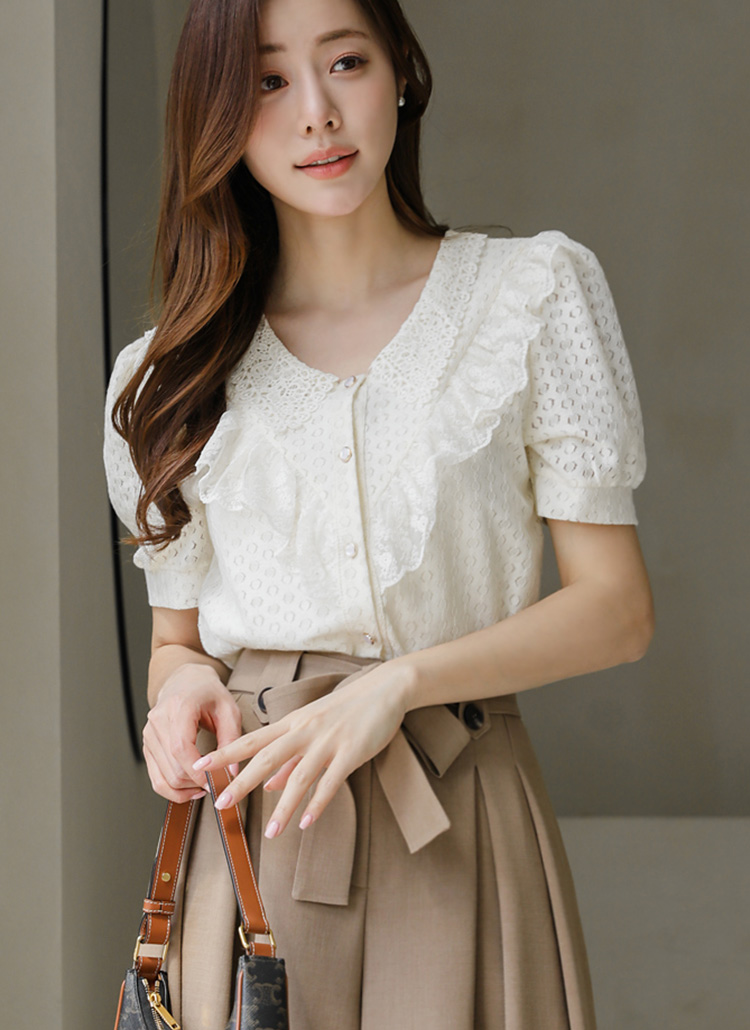 V领荷叶边珠串纽扣衬衫