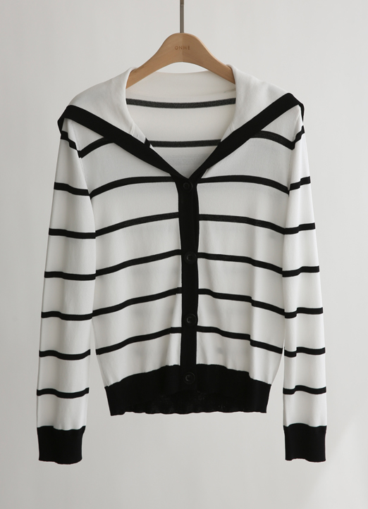 스트라이프 뒷 레터링 세라카라 단추 가디건이에요:)