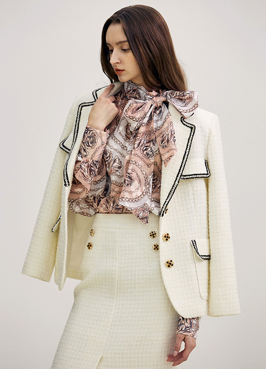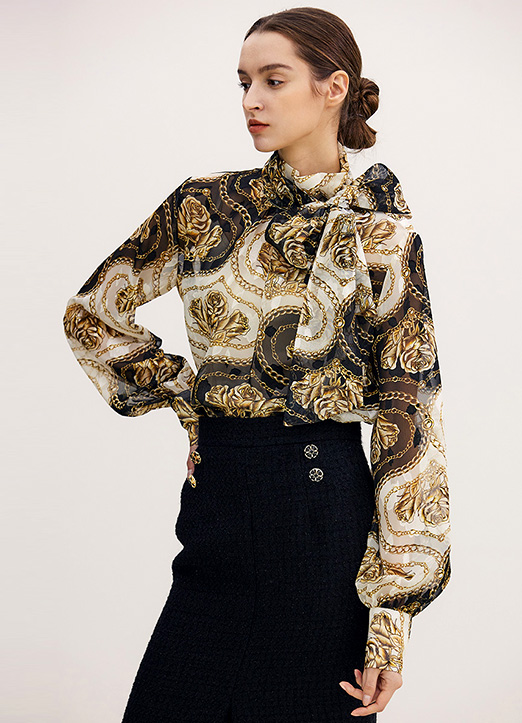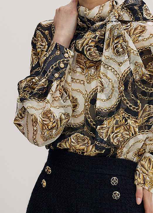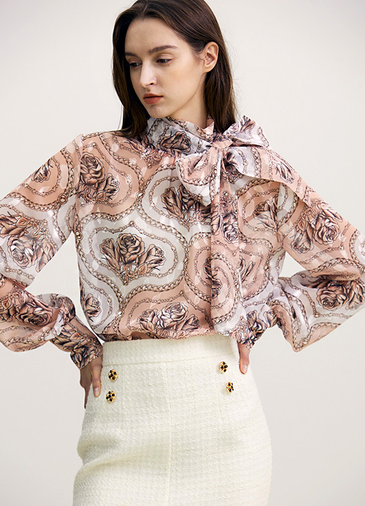 [THE ONME] 优雅玫瑰提花领带雪纺衫