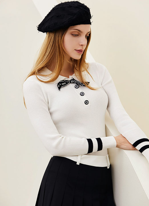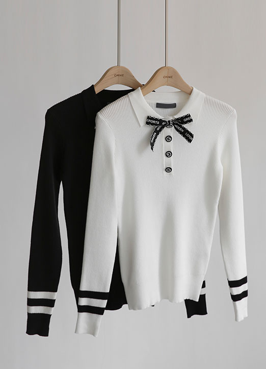 [QoG] 高尔夫蝴蝶结胸针套装领子配色竖纹针织衫