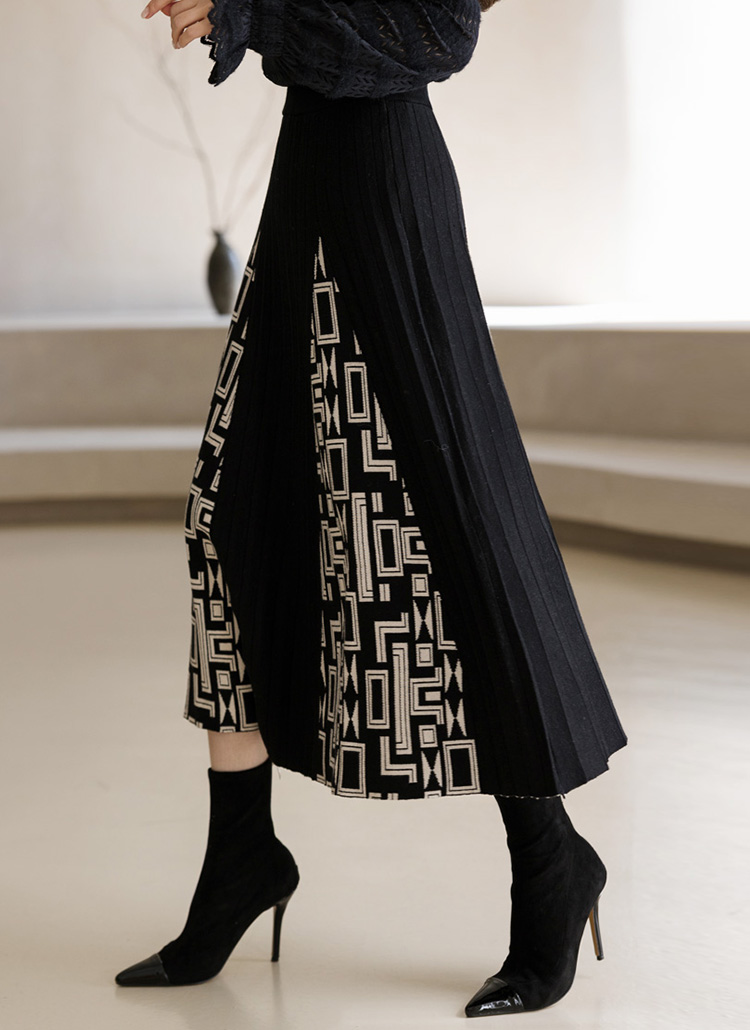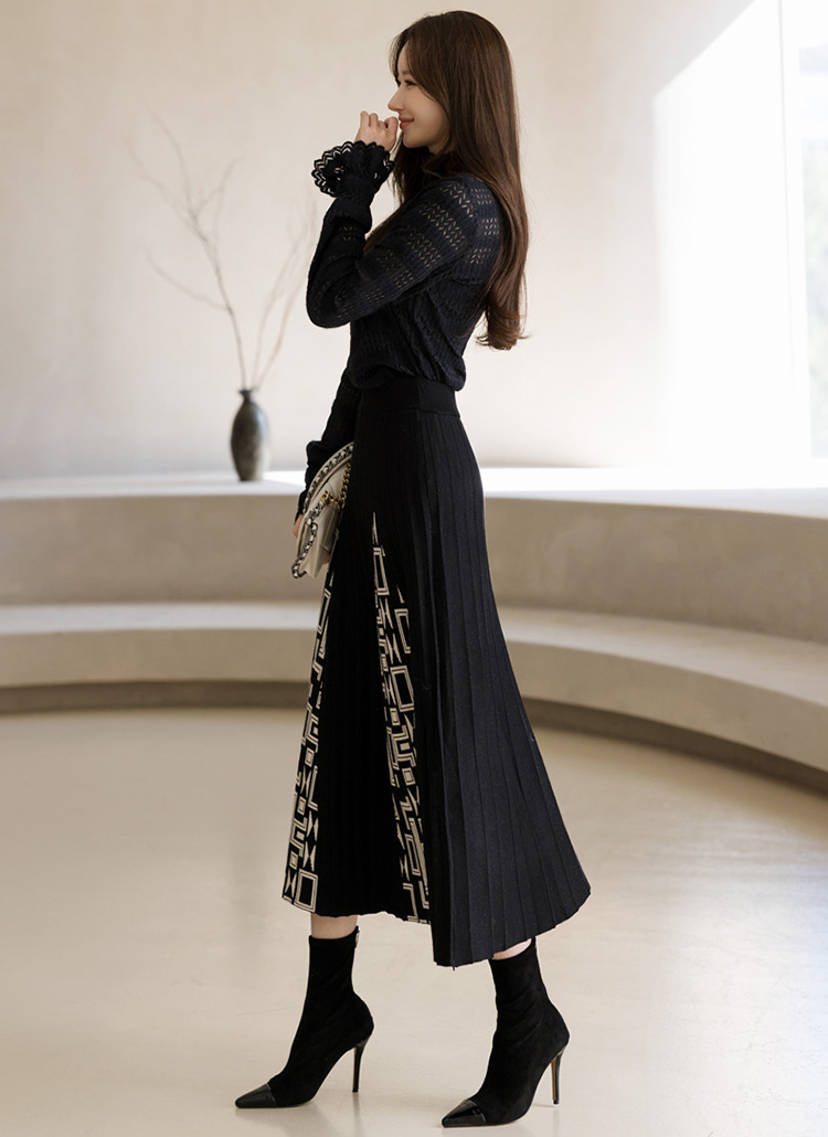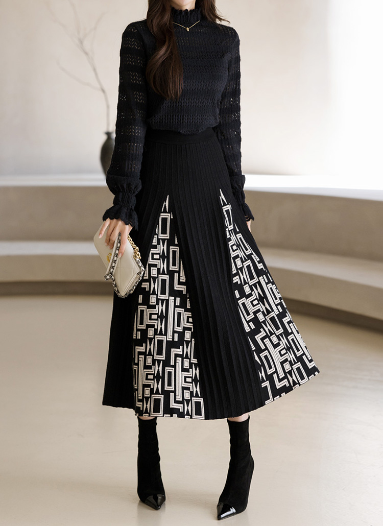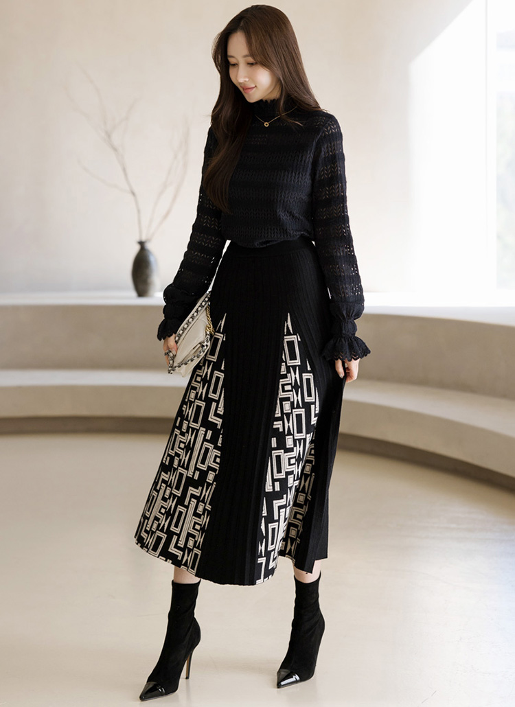 镂空几何图案褶边针织长裙