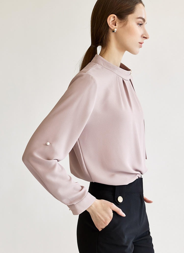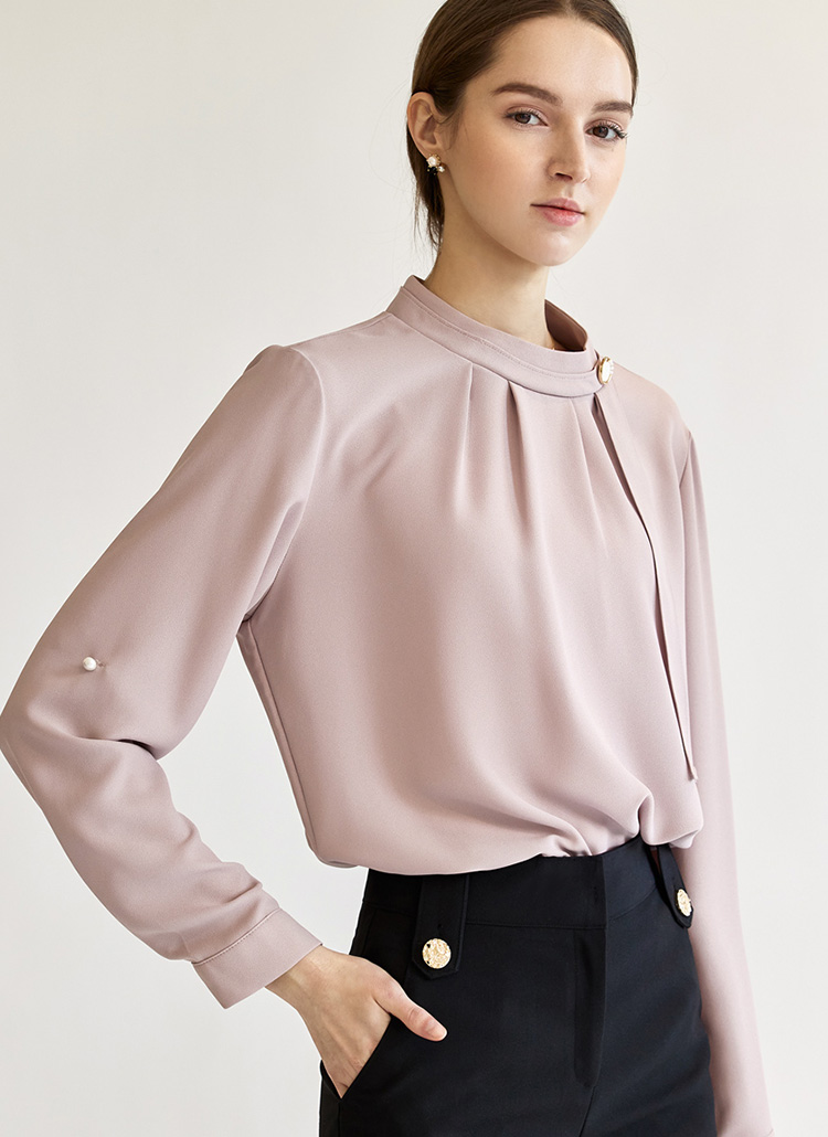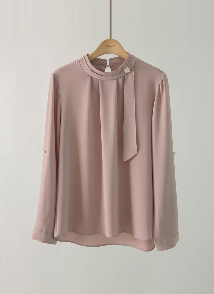 한쪽 사이드로 드롭되는 리본타이 넥 디테일에