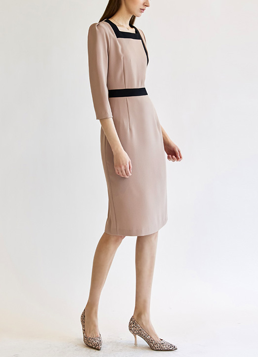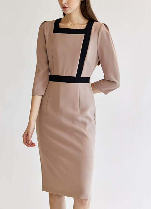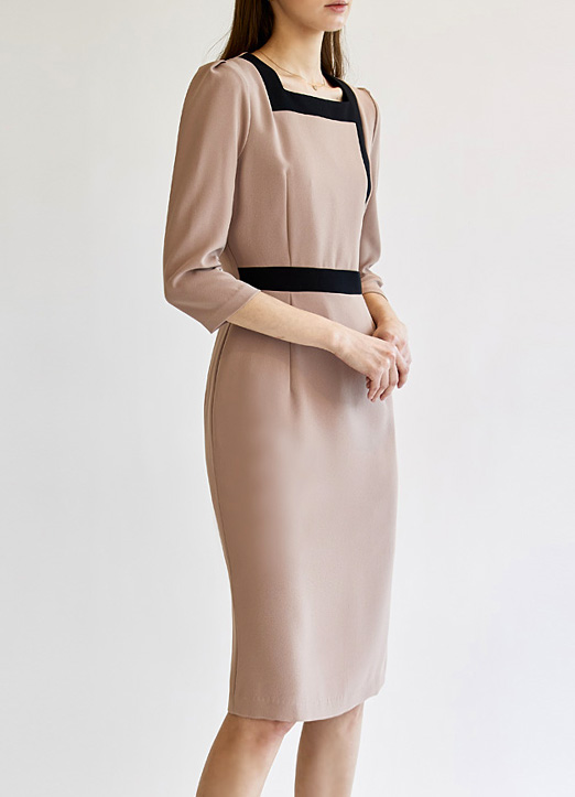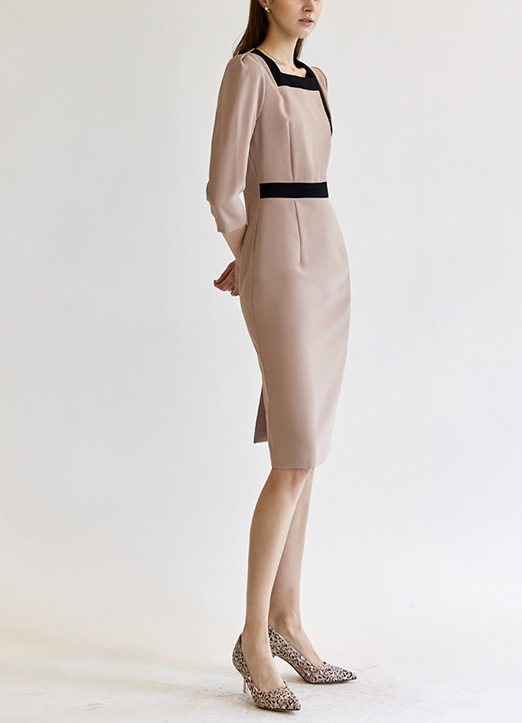 [Theonme] 方形领线条配色捏褶连衣裙