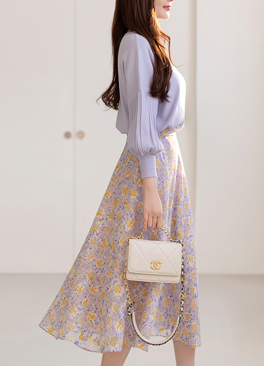 [Louis Angel] 紫色花纹配色后松紧带喇叭长裙