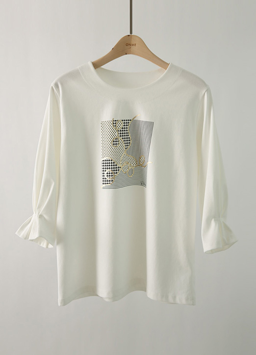 金色线条圆点混合印花抽褶T恤