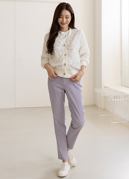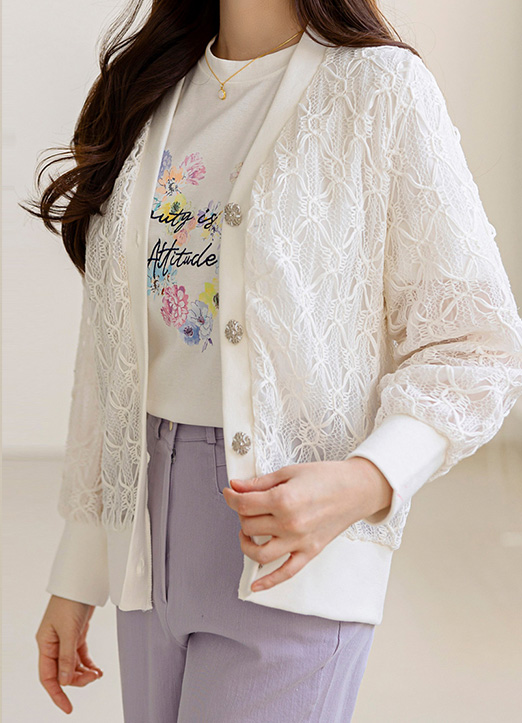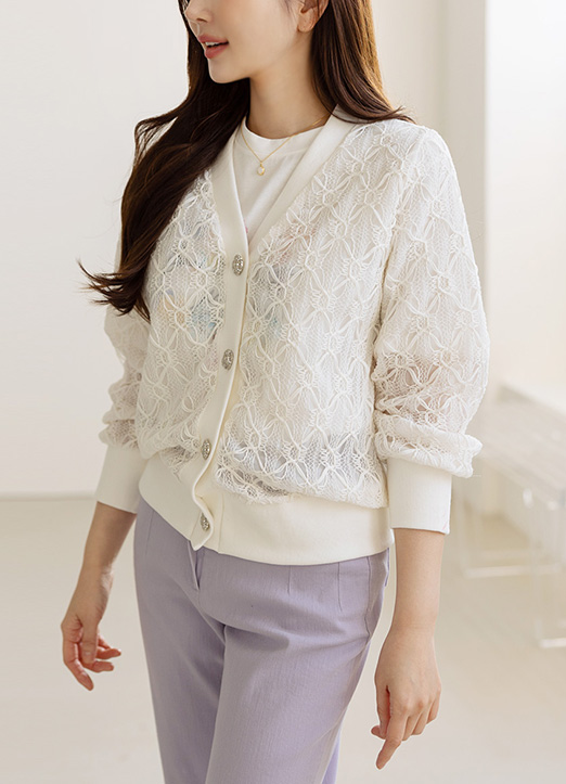 쥬얼리 버튼이 더해진 레이스 소재의 가디건으로