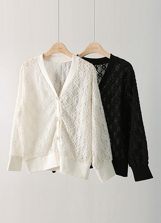 [添加了珠宝纽扣的蕾丝材质的开衫, 高档且有女人味的单品:) V领设计不会显得闷, 袖子和下摆用罗纹布牢牢抓住线条, 穿着舒适!]