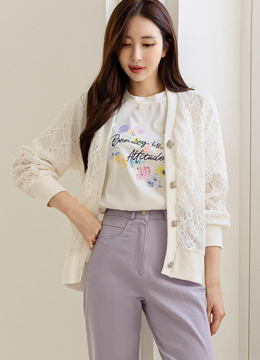 쥬얼리 버튼이 더해진 레이스 소재의 가디건으로