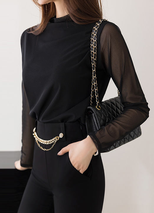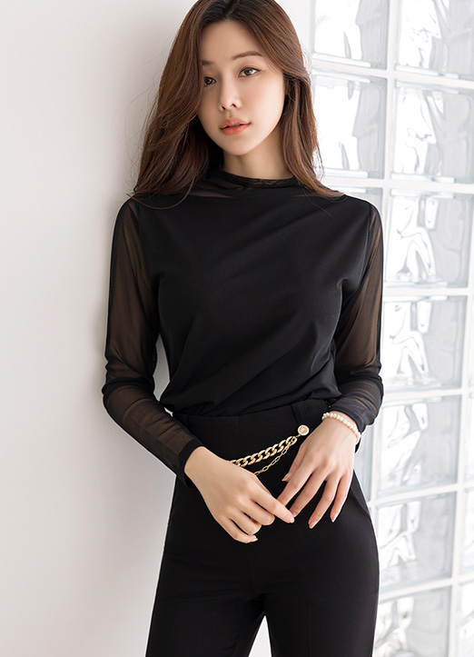 [透视的网纱蕾丝有内衬~适合帅气享受的雪纺衫T恤~接触肌肤的丝滑触感,添加了氨纶,以紧致的弹性,动作也轻松~穿起来非常舒适。]