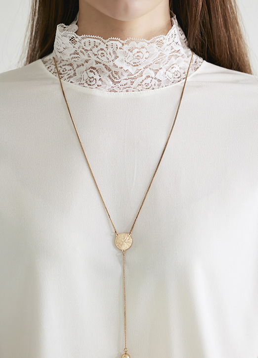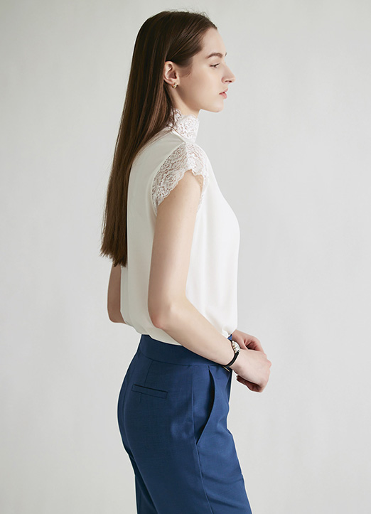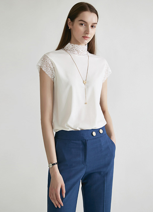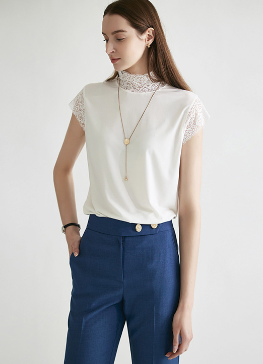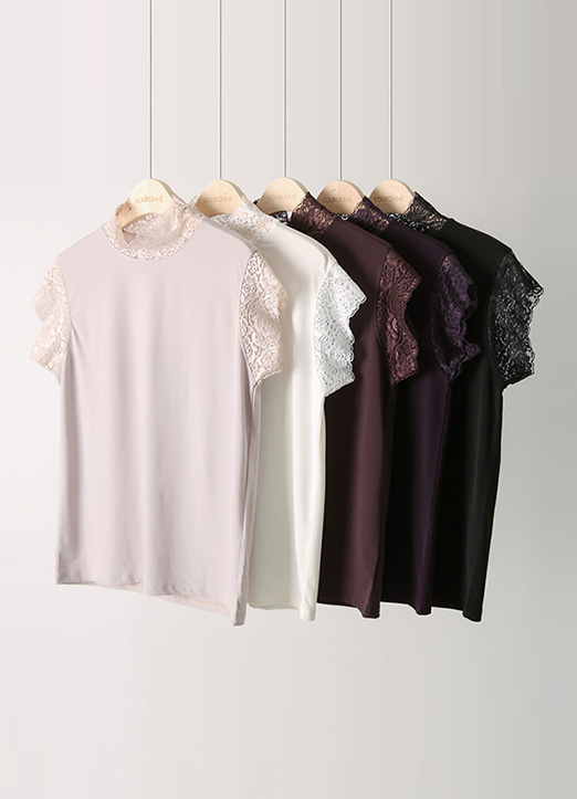 [稍微上扬的高领和盖袖设计, 以透视的蕾丝,展现稚嫩且女人味十足的雪纺衫T恤, 飘逸的材质感制作而成, 可以享受高满意度的雪纺衫T恤。]