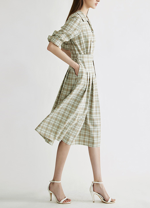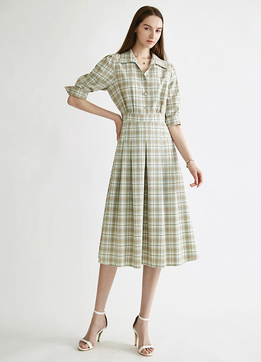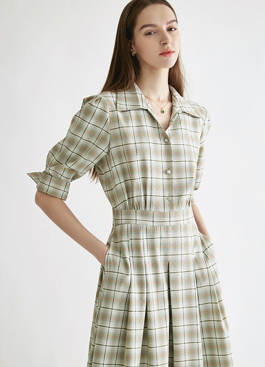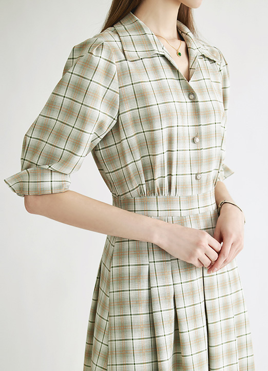 [Theonme] 卷边泡泡7分袖格纹连衣裙